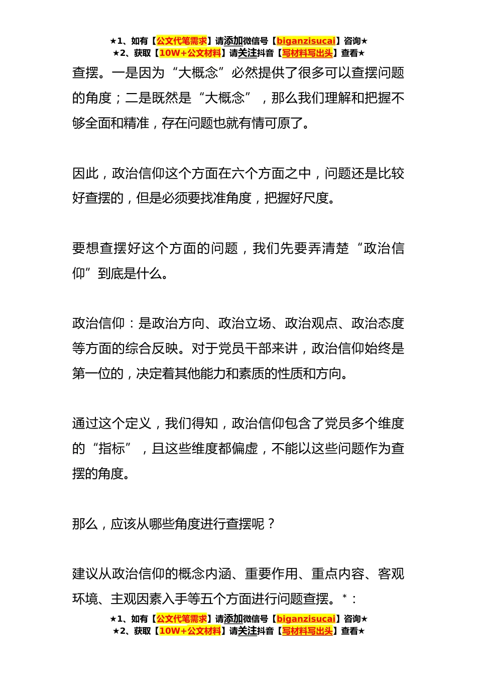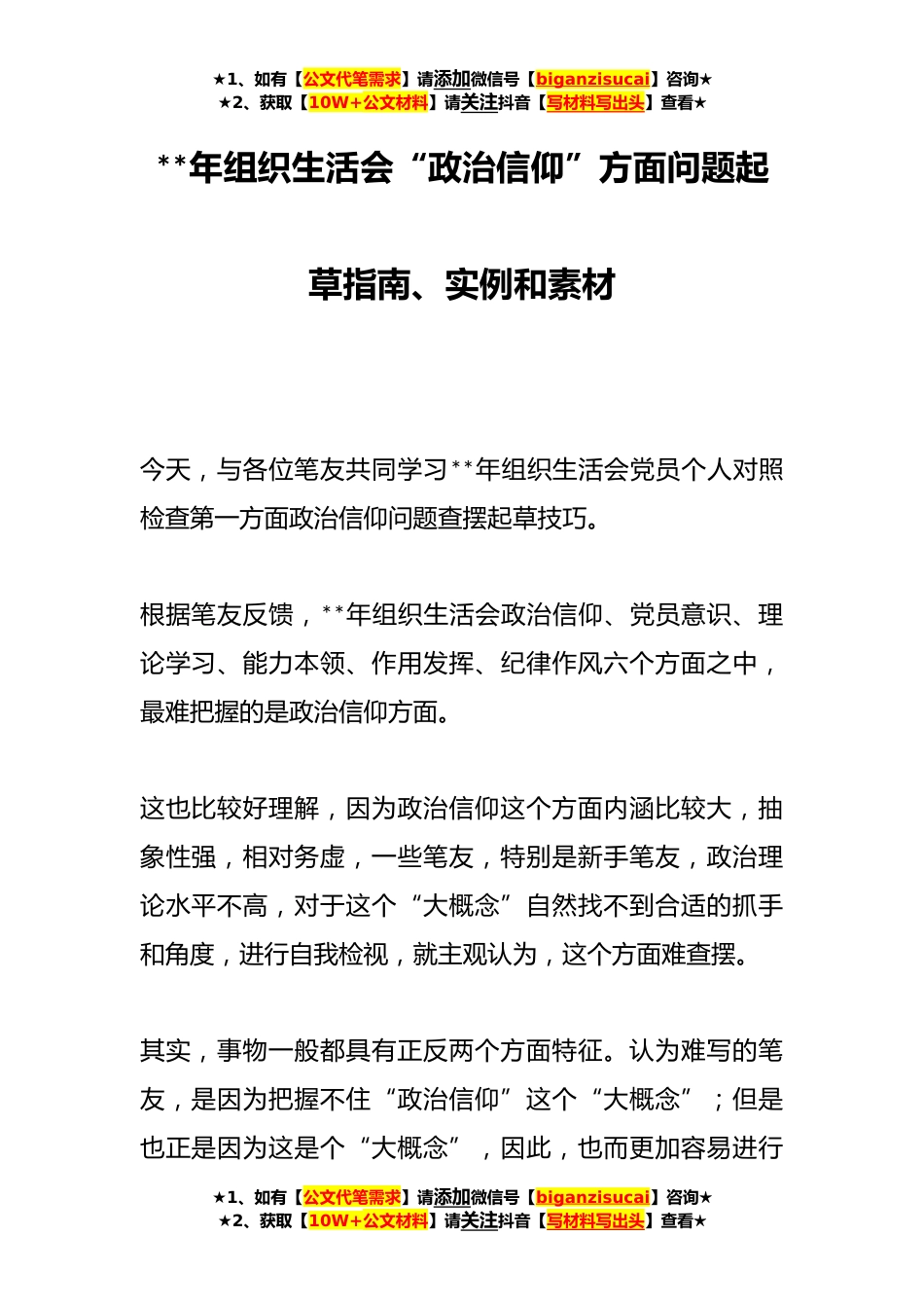 ★1、如有【公文代笔需求】请添加微信号【biganzisucai】咨询★★2、获取【10W+公文材料】请关注抖音【写材料写出头】查看★**年组织生活会“政治信仰”方面问题起草指南、实例和素材今天,与各位笔友共同学习**年组织生活会党员个人对照检查第一方面政治信仰问题查摆起草技巧。根据笔友反馈,**年组织生活会政治信仰、党员意识、理论学习、能力本领、作用发挥、纪律作风六个方面之中,最难把握的是政治信仰方面。这也比较好理解,因为政治信仰这个方面内涵比较大,抽象性强,相对务虚,一些笔友,特别是新手笔友,政治理论水平不高,对于这个“大概念”自然找不到合适的抓手和角度,进行自我检视,就主观认为,这个方面难查摆。其实,事物一般都具有正反两个方面特征。认为难写的笔友,是因为把握不住“政治信仰...