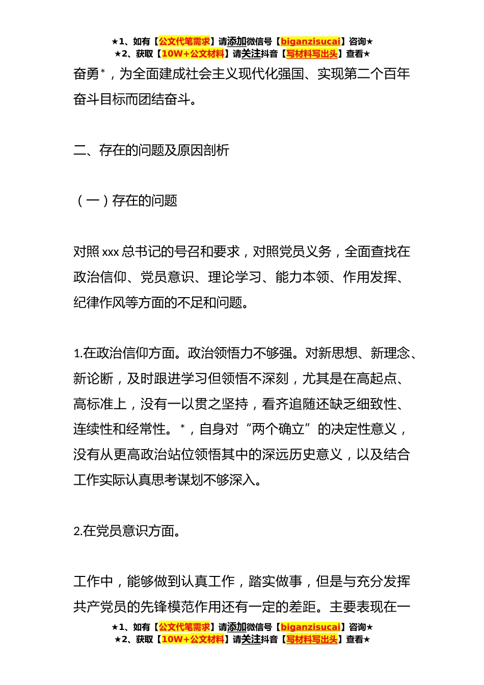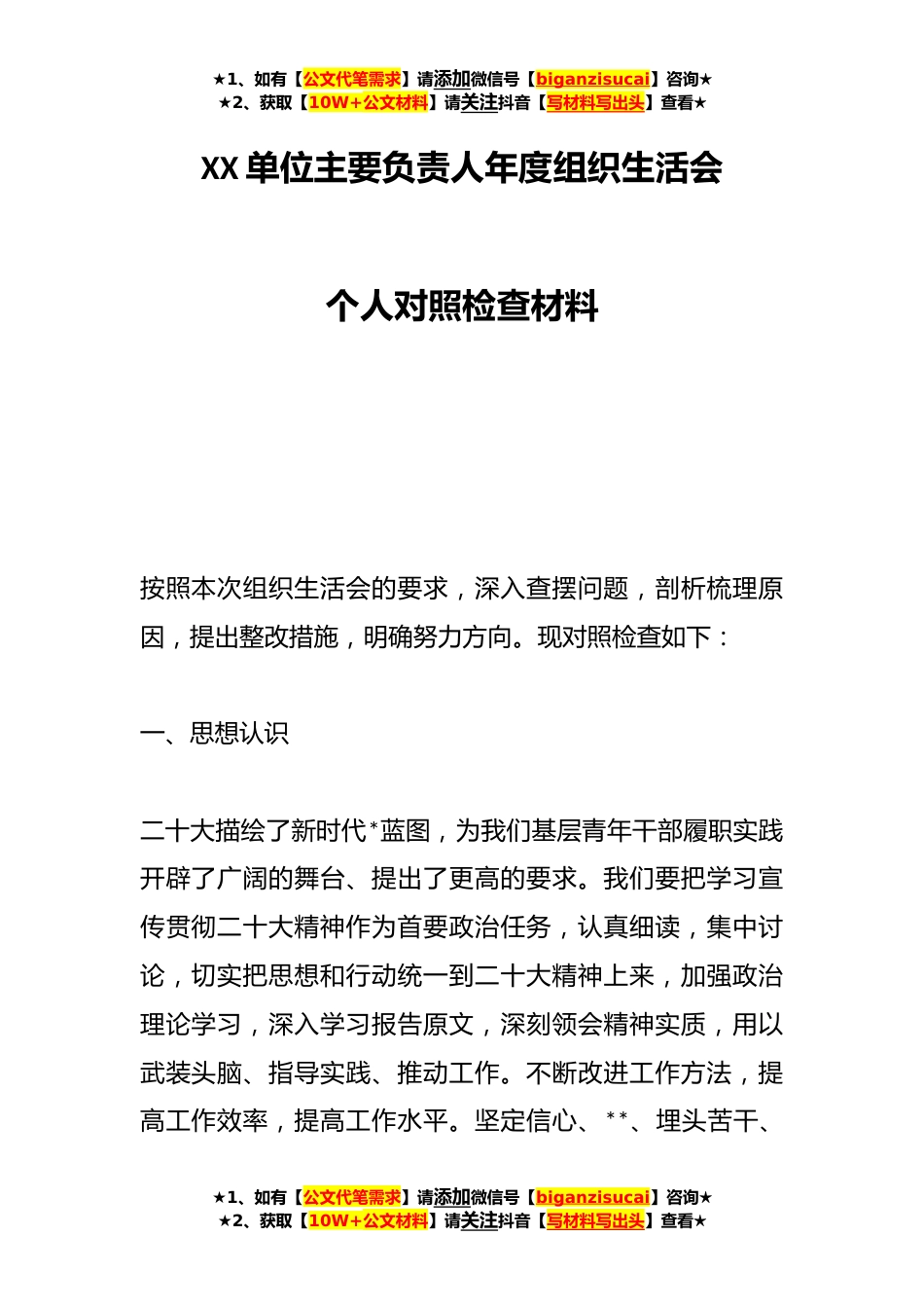 ★1、如有【公文代笔需求】请添加微信号【biganzisucai】咨询★★2、获取【10W+公文材料】请关注抖音【写材料写出头】查看★XX单位主要负责人年度组织生活会个人对照检查材料按照本次组织生活会的要求,深入查摆问题,剖析梳理原因,提出整改措施,明确努力方向。现对照检查如下:一、思想认识二十大描绘了新时代*蓝图,为我们基层青年干部履职实践开辟了广阔的舞台、提出了更高的要求。我们要把学习宣传贯彻二十大精神作为首要政治任务,认真细读,集中讨论,切实把思想和行动统一到二十大精神上来,加强政治理论学习,深入学习报告原文,深刻领会精神实质,用以武装头脑、指导实践、推动工作。不断改进工作方法,提高工作效率,提高工作水平。坚定信心、**、埋头苦干、★1、如有【公文代笔需求】请添加微信号【b...