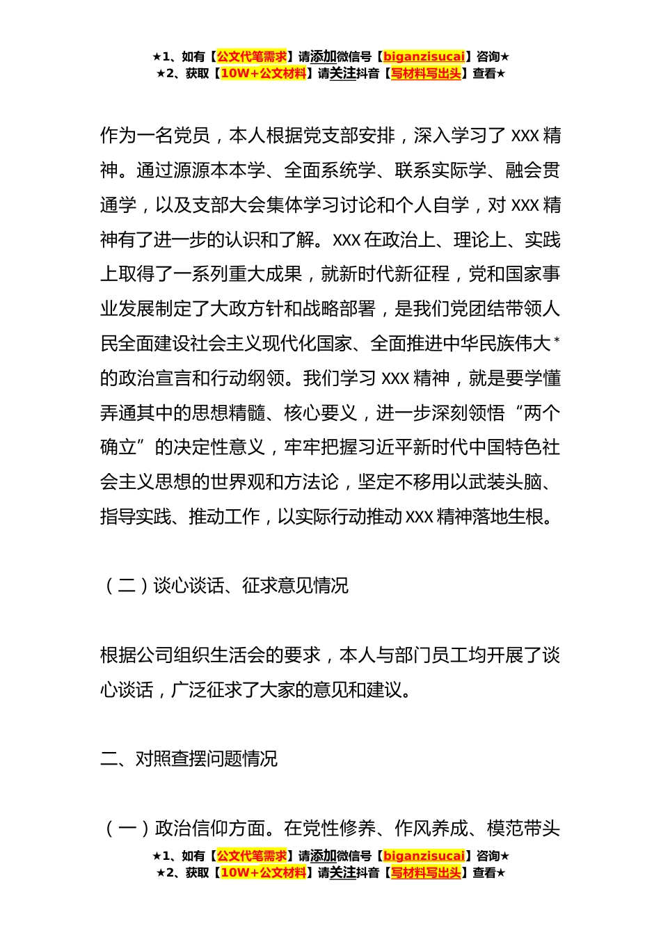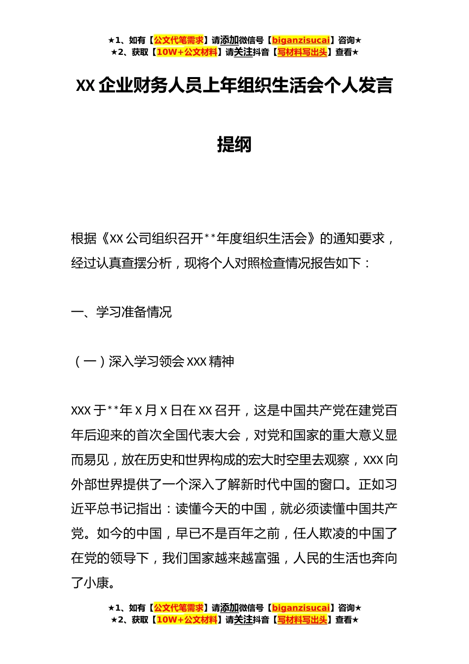 ★1、如有【公文代笔需求】请添加微信号【biganzisucai】咨询★★2、获取【10W+公文材料】请关注抖音【写材料写出头】查看★XX企业财务人员上年组织生活会个人发言提纲根据《XX公司组织召开**年度组织生活会》的通知要求,经过认真查摆分析,现将个人对照检查情况报告如下:一、学习准备情况(一)深入学习领会XXX精神XXX于**年X月X日在XX召开,这是中国共产党在建党百年后迎来的首次全国代表大会,对党和国家的重大意义显而易见,放在历史和世界构成的宏大时空里去观察,XXX向外部世界提供了一个深入了解新时代中国的窗口。正如习近平总书记指出:读懂今天的中国,就必须读懂中国共产党。如今的中国,早已不是百年之前,任人欺凌的中国了在党的领导下,我们国家越来越富强,人民的生活也奔向了小康。★1、如有【...