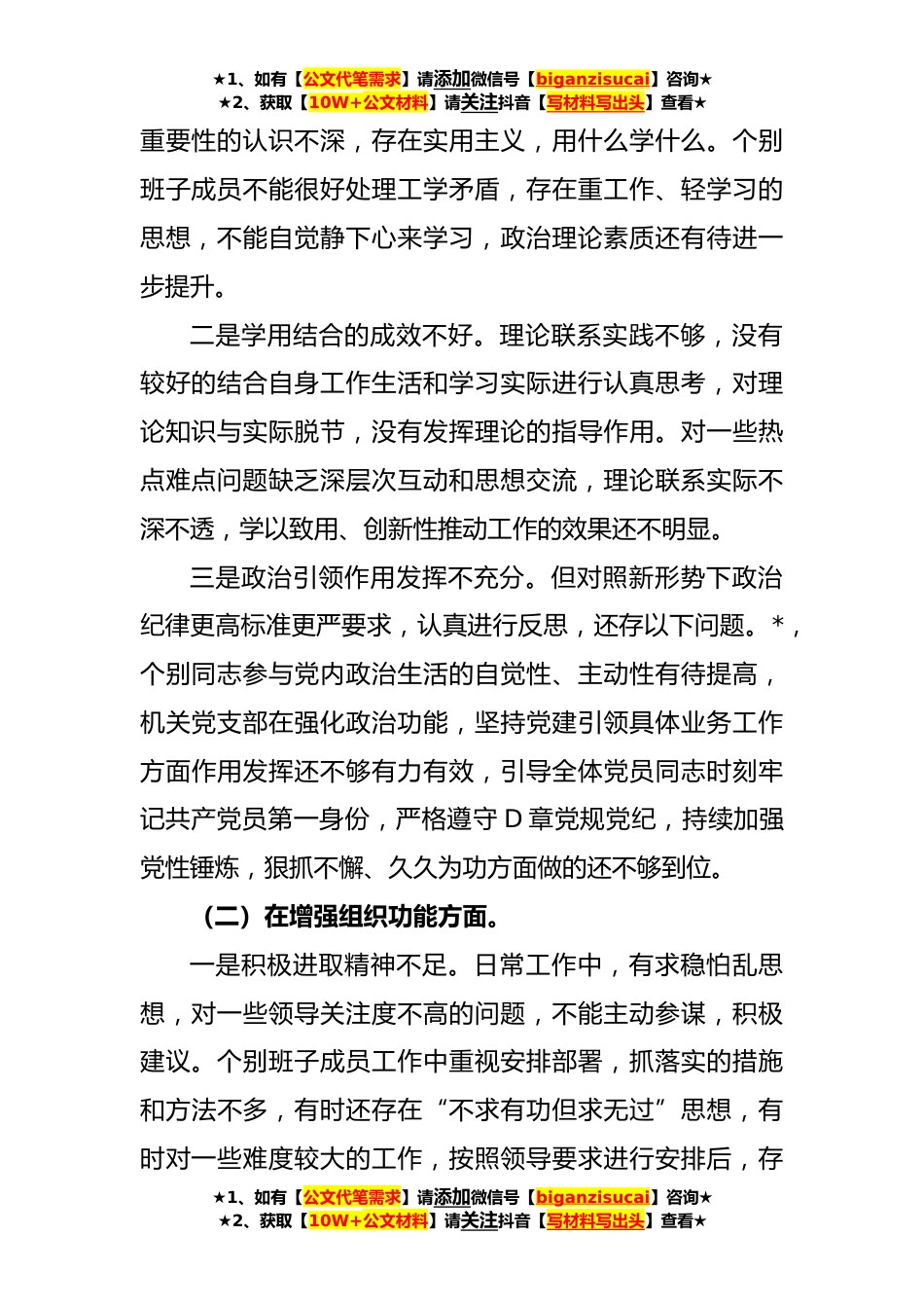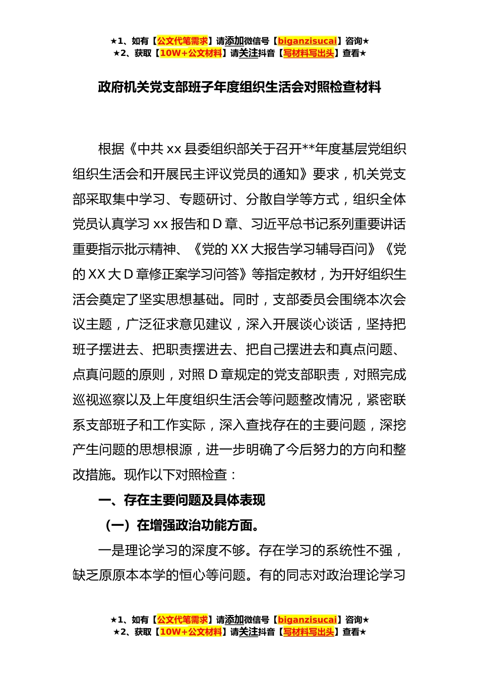 ★1、如有【公文代笔需求】请添加微信号【biganzisucai】咨询★★2、获取【10W+公文材料】请关注抖音【写材料写出头】查看★政府机关党支部班子年度组织生活会对照检查材料根据《中共xx县委组织部关于召开**年度基层党组织组织生活会和开展民主评议党员的通知》要求,机关党支部采取集中学习、专题研讨、分散自学等方式,组织全体党员认真学习xx报告和D章、习近平总书记系列重要讲话重要指示批示精神、《党的XX大报告学习辅导百问》《党的XX大D章修正案学习问答》等指定教材,为开好组织生活会奠定了坚实思想基础。同时,支部委员会围绕本次会议主题,广泛征求意见建议,深入开展谈心谈话,坚持把班子摆进去、把职责摆进去、把自己摆进去和真点问题、点真问题的原则,对照D章规定的党支部职责,对照完成巡视巡察以...