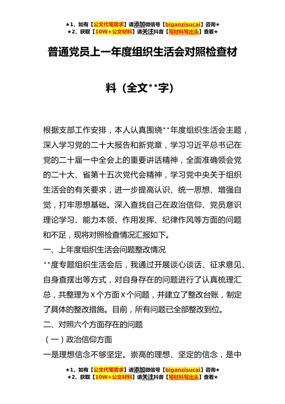 ★1、如有【公文代笔需求】请添加微信号【biganzisucai】咨询★★2、获取【10W+公文材料】请关注抖音【写材料写出头】查看★普通党员上一年度组织生活会对照检查材料(全文**字)根据支部工作安排,本人认真围绕**年度组织生活会主题,深入学习党的二十大报告和新党章,学习习近平总书记在党的二十届一中全会上的重要讲话精神,全面准确领会党的二十大、省第十五次党代会精神,学习党中央关于组织生活会的有关要求,进一步提高认识、统一思想、增强自觉,打牢思想基础。深入查找自己在政治信仰、党员意识理论学习、能力本领、作用发挥、纪律作风等方面的问题和不足,现将对照检查情况汇报如下。一、上年度组织生活会问题整改情况**度专题组织生活会后,我通过开展谈心谈话、征求意见、自身查摆出等方式,对自身存...