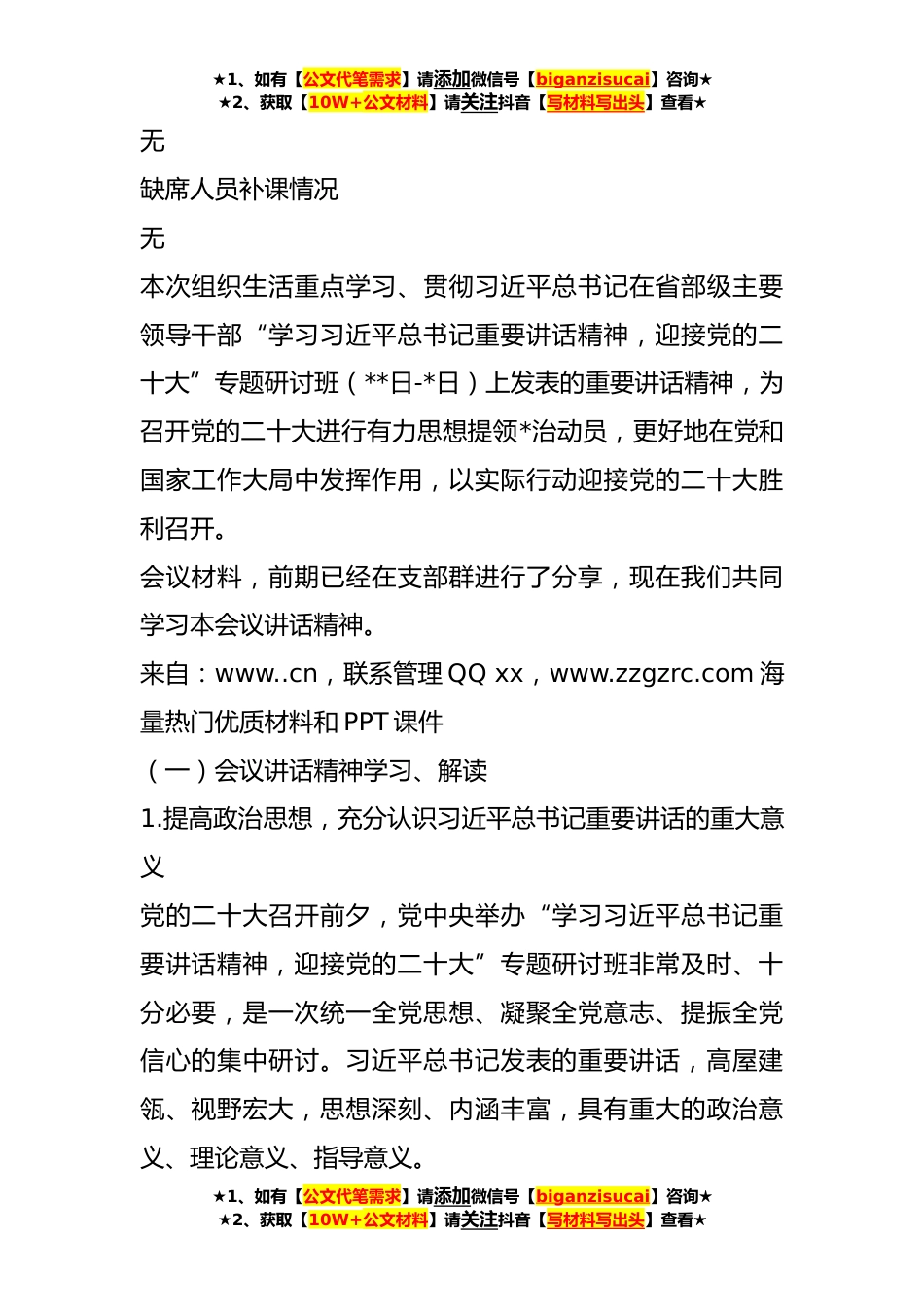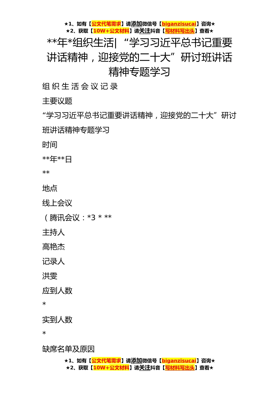 ★1、如有【公文代笔需求】请添加微信号【biganzisucai】咨询★★2、获取【10W+公文材料】请关注抖音【写材料写出头】查看★**年*组织生活|“学习习近平总书记重要讲话精神,迎接党的二十大”研讨班讲话精神专题学习组织生活会议记录主要议题“学习习近平总书记重要讲话精神,迎接党的二十大”研讨班讲话精神专题学习时间**年**日**地点线上会议(腾讯会议:*3***主持人高艳杰记录人洪雯应到人数*实到人数*缺席名单及原因★1、如有【公文代笔需求】请添加微信号【biganzisucai】咨询★★2、获取【10W+公文材料】请关注抖音【写材料写出头】查看★★1、如有【公文代笔需求】请添加微信号【biganzisucai】咨询★★2、获取【10W+公文材料】请关注抖音【写材料写出头】查看★无缺席人员补课情况无本次组织生活重点学习...