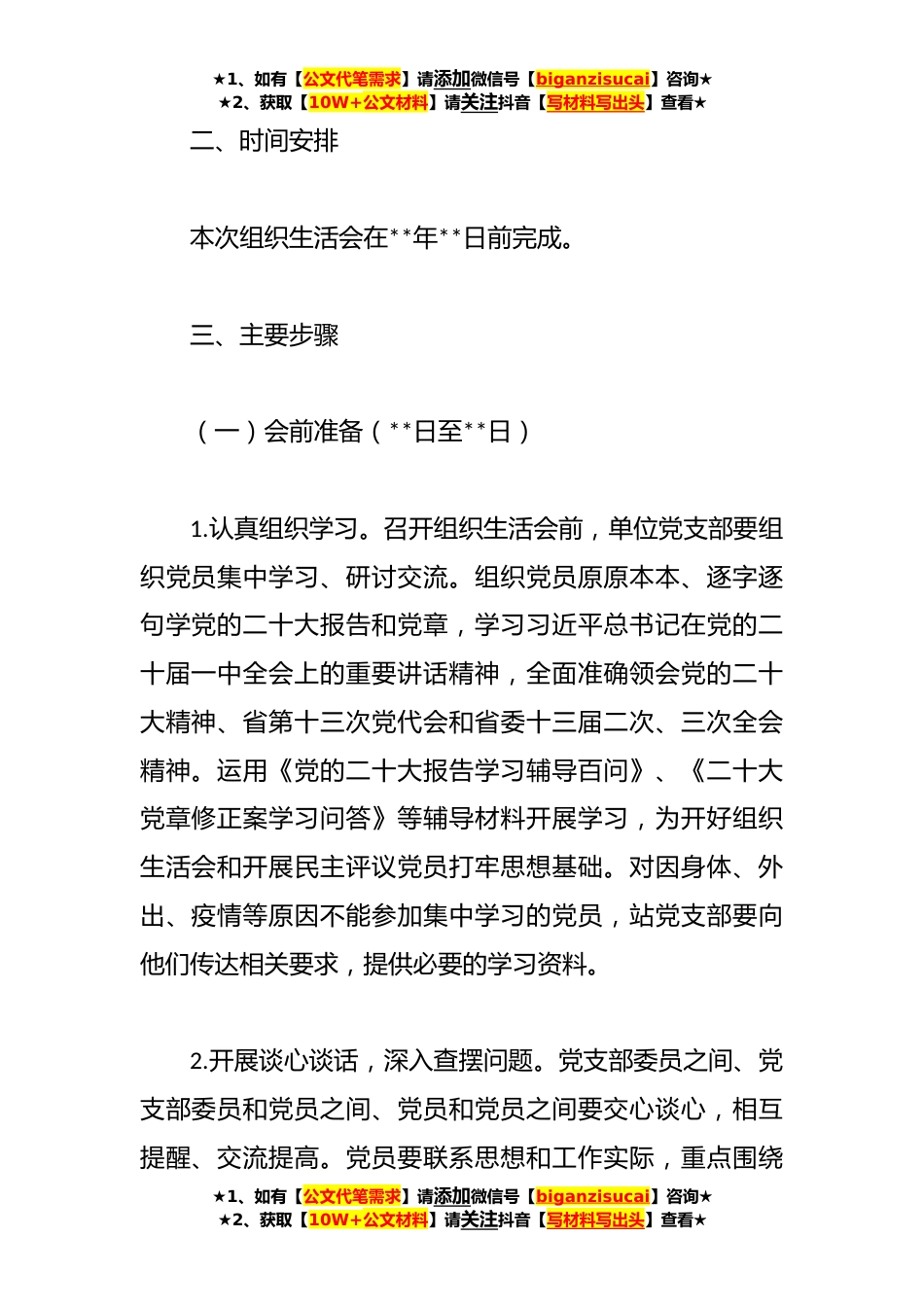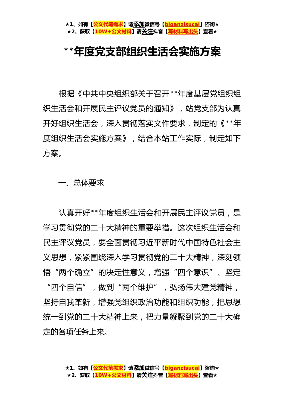 ★1、如有【公文代笔需求】请添加微信号【biganzisucai】咨询★★2、获取【10W+公文材料】请关注抖音【写材料写出头】查看★**年度党支部组织生活会实施方案根据《中共中央组织部关于召开**年度基层党组织组织生活会和开展民主评议党员的通知》,站党支部为认真开好组织生活会,深入贯彻落实文件要求,制定的《**年度组织生活会实施方案》,结合本站工作实际,制定如下方案。一、总体要求认真开好**年度组织生活会和开展民主评议党员,是学习贯彻党的二十大精神的重要举措。这次组织生活会和民主评议党员,要全面贯彻习近平新时代中国特色社会主义思想,紧紧围绕深入学习贯彻党的二十大精神,深刻领悟“两个确立”的决定性意义,增强“四个意识”、坚定“四个自信”,做到“两个维护”,弘扬伟大建党精神,坚持自...
