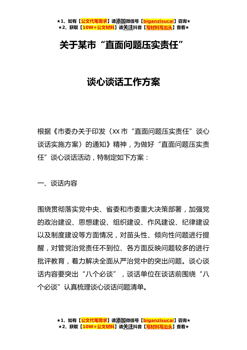 ★1、如有【公文代笔需求】请添加微信号【biganzisucai】咨询★★2、获取【10W+公文材料】请关注抖音【写材料写出头】查看★关于某市“直面问题压实责任”谈心谈话工作方案根据《市委办关于印发〈XX市“直面问题压实责任”谈心谈话实施方案〉的通知》精神,为做好“直面问题压实责任”谈心谈话活动,特制定如下方案:一、谈话内容围绕贯彻落实党中央、省委和市委重大决策部署,加强党的政治建设、思想建设、组织建设、作风建设、纪律建设以及制度建设等方面情况,对苗头性、倾向性问题进行提醒,对管党治党责任不到位、各方面反映问题较多的进行批评教育,着力解决全面从严治党中的突出问题。谈心谈话内容要突出“八个必谈”,谈话单位在谈话前围绕“八个必谈”认真梳理谈心谈话问题清单。★1、如有【公文代笔需求...