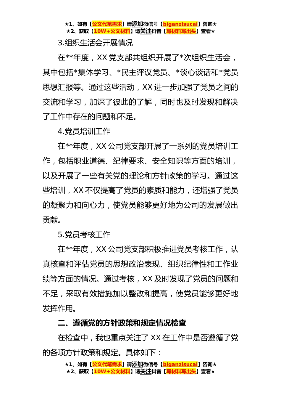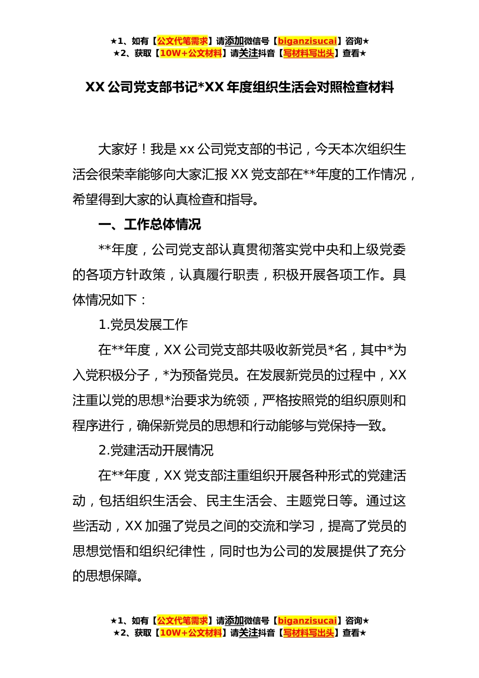 ★1、如有【公文代笔需求】请添加微信号【biganzisucai】咨询★★2、获取【10W+公文材料】请关注抖音【写材料写出头】查看★XX公司党支部书记*XX年度组织生活会对照检查材料大家好!我是xx公司党支部的书记,今天本次组织生活会很荣幸能够向大家汇报XX党支部在**年度的工作情况,希望得到大家的认真检查和指导。一、工作总体情况**年度,公司党支部认真贯彻落实党中央和上级党委的各项方针政策,认真履行职责,积极开展各项工作。具体情况如下:1.党员发展工作在**年度,XX公司党支部共吸收新党员*名,其中*为入党积极分子,*为预备党员。在发展新党员的过程中,XX注重以党的思想*治要求为统领,严格按照党的组织原则和程序进行,确保新党员的思想和行动能够与党保持一致。2.党建活动开展情况在**年度,XX党支部注...