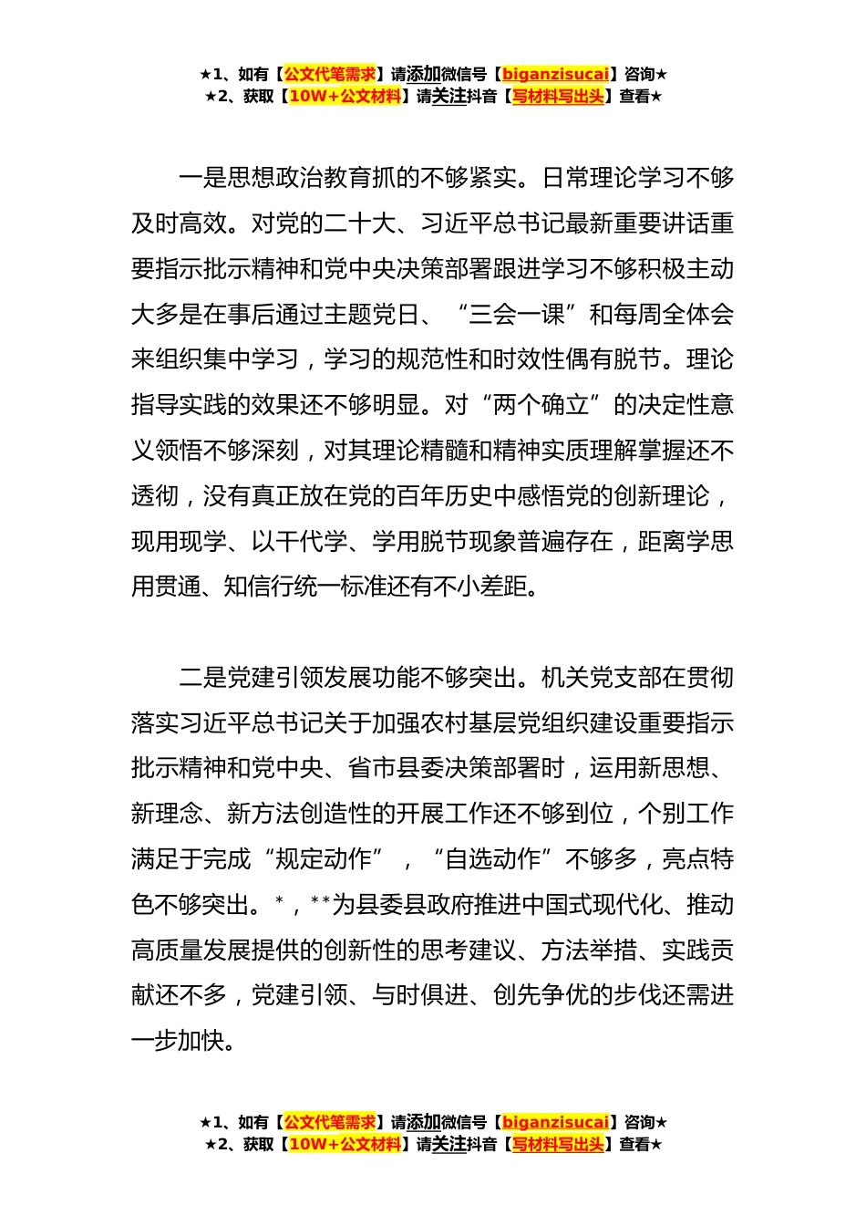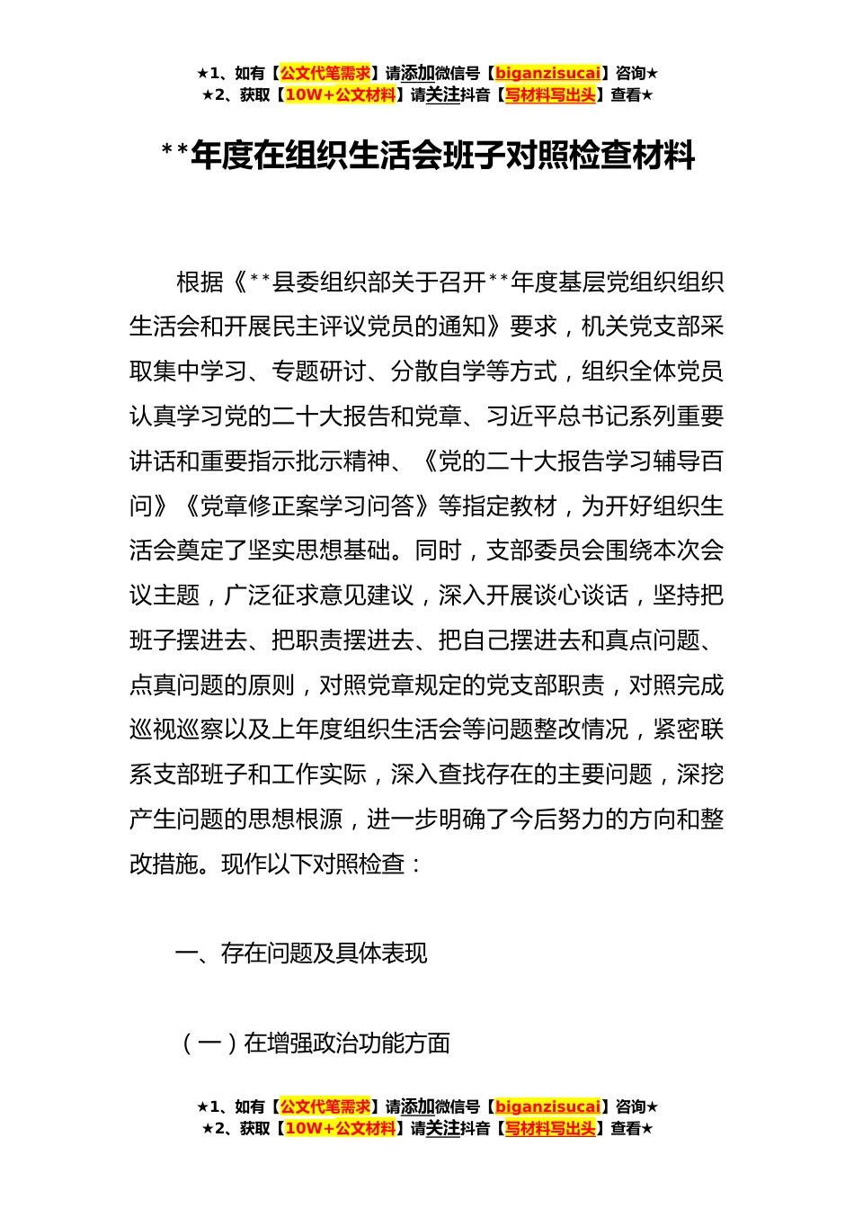 ★1、如有【公文代笔需求】请添加微信号【biganzisucai】咨询★★2、获取【10W+公文材料】请关注抖音【写材料写出头】查看★**年度在组织生活会班子对照检查材料根据《**县委组织部关于召开**年度基层党组织组织生活会和开展民主评议党员的通知》要求,机关党支部采取集中学习、专题研讨、分散自学等方式,组织全体党员认真学习党的二十大报告和党章、习近平总书记系列重要讲话和重要指示批示精神、《党的二十大报告学习辅导百问》《党章修正案学习问答》等指定教材,为开好组织生活会奠定了坚实思想基础。同时,支部委员会围绕本次会议主题,广泛征求意见建议,深入开展谈心谈话,坚持把班子摆进去、把职责摆进去、把自己摆进去和真点问题、点真问题的原则,对照党章规定的党支部职责,对照完成巡视巡察以及上年...