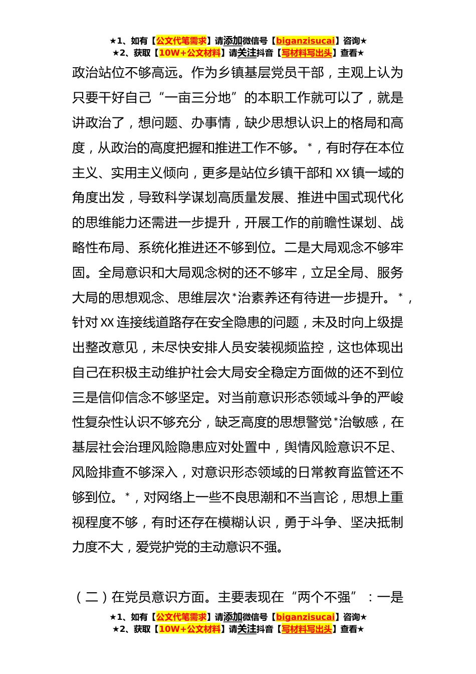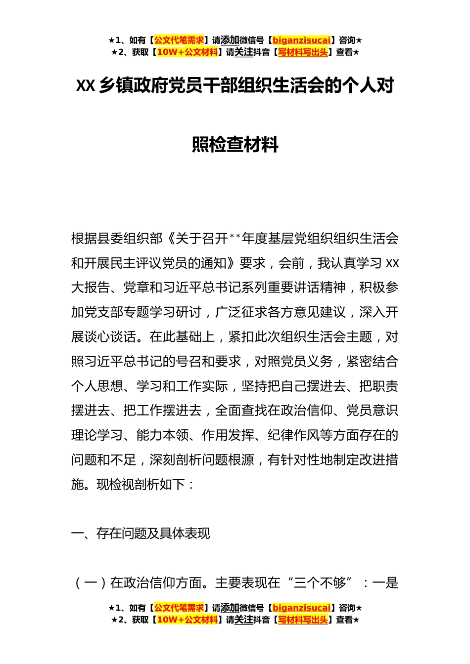 ★1、如有【公文代笔需求】请添加微信号【biganzisucai】咨询★★2、获取【10W+公文材料】请关注抖音【写材料写出头】查看★XX乡镇政府党员干部组织生活会的个人对照检查材料根据县委组织部《关于召开**年度基层党组织组织生活会和开展民主评议党员的通知》要求,会前,我认真学习XX大报告、党章和习近平总书记系列重要讲话精神,积极参加党支部专题学习研讨,广泛征求各方意见建议,深入开展谈心谈话。在此基础上,紧扣此次组织生活会主题,对照习近平总书记的号召和要求,对照党员义务,紧密结合个人思想、学习和工作实际,坚持把自己摆进去、把职责摆进去、把工作摆进去,全面查找在政治信仰、党员意识理论学习、能力本领、作用发挥、纪律作风等方面存在的问题和不足,深刻剖析问题根源,有针对性地制定改进措...