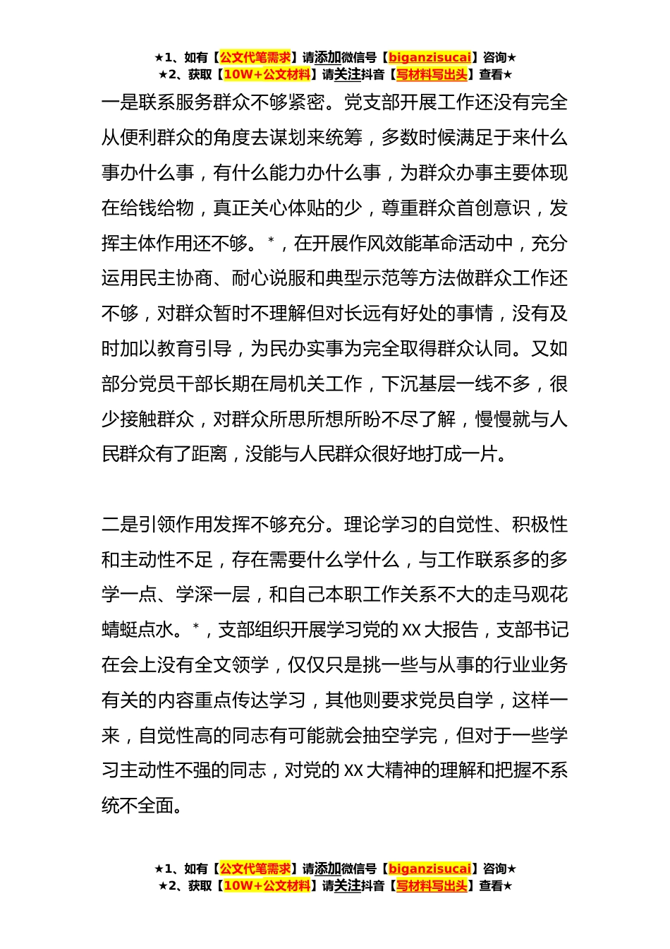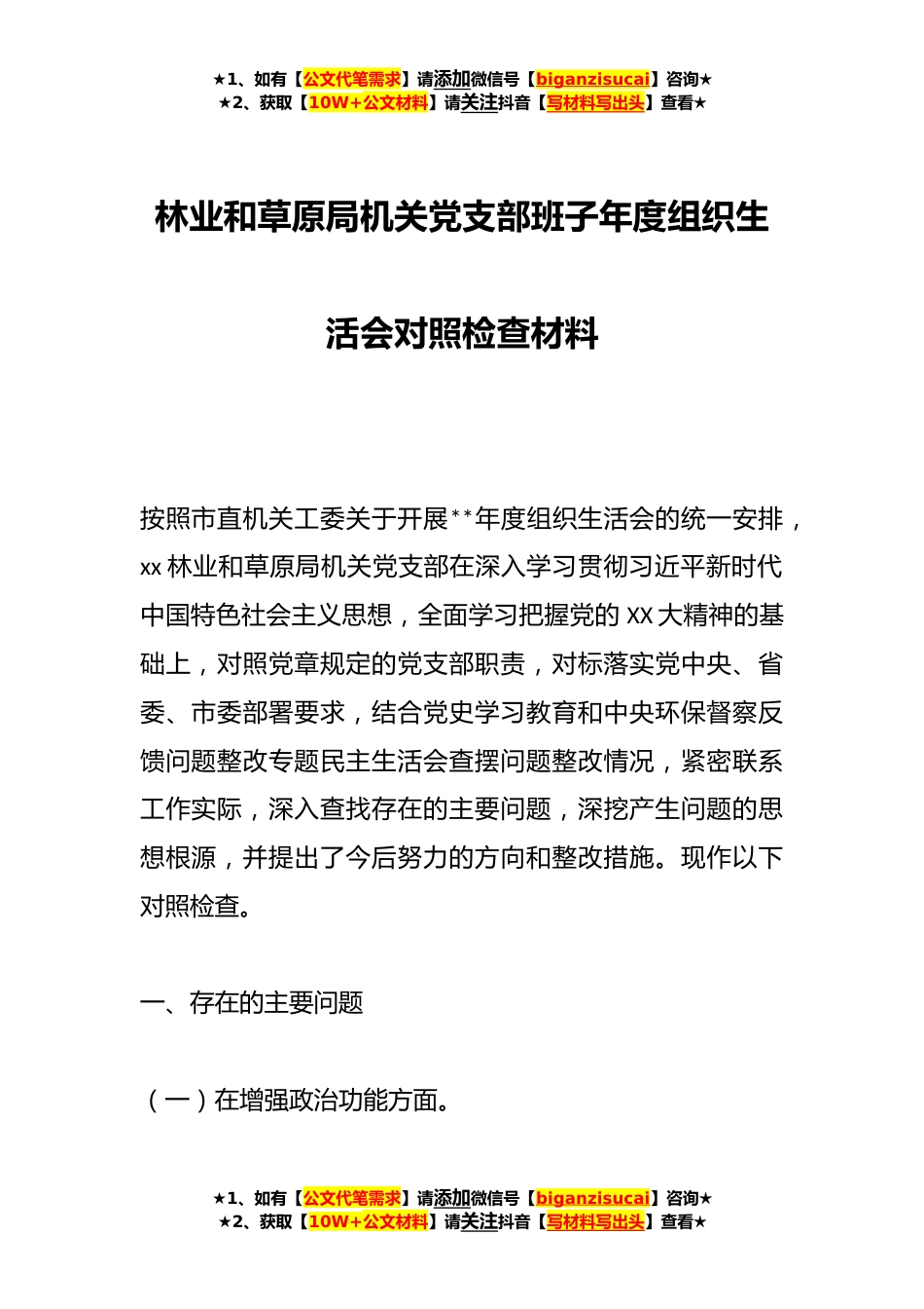 ★1、如有【公文代笔需求】请添加微信号【biganzisucai】咨询★★2、获取【10W+公文材料】请关注抖音【写材料写出头】查看★林业和草原局机关党支部班子年度组织生活会对照检查材料按照市直机关工委关于开展**年度组织生活会的统一安排,xx林业和草原局机关党支部在深入学习贯彻习近平新时代中国特色社会主义思想,全面学习把握党的XX大精神的基础上,对照党章规定的党支部职责,对标落实党中央、省委、市委部署要求,结合党史学习教育和中央环保督察反馈问题整改专题民主生活会查摆问题整改情况,紧密联系工作实际,深入查找存在的主要问题,深挖产生问题的思想根源,并提出了今后努力的方向和整改措施。现作以下对照检查。一、存在的主要问题(一)在增强政治功能方面。★1、如有【公文代笔需求】请添加微信号【...