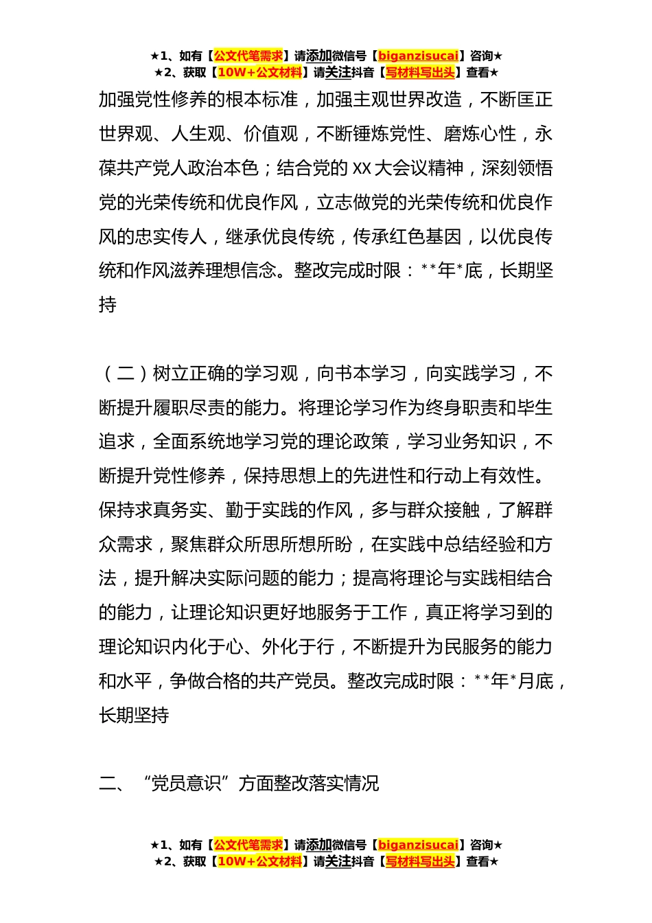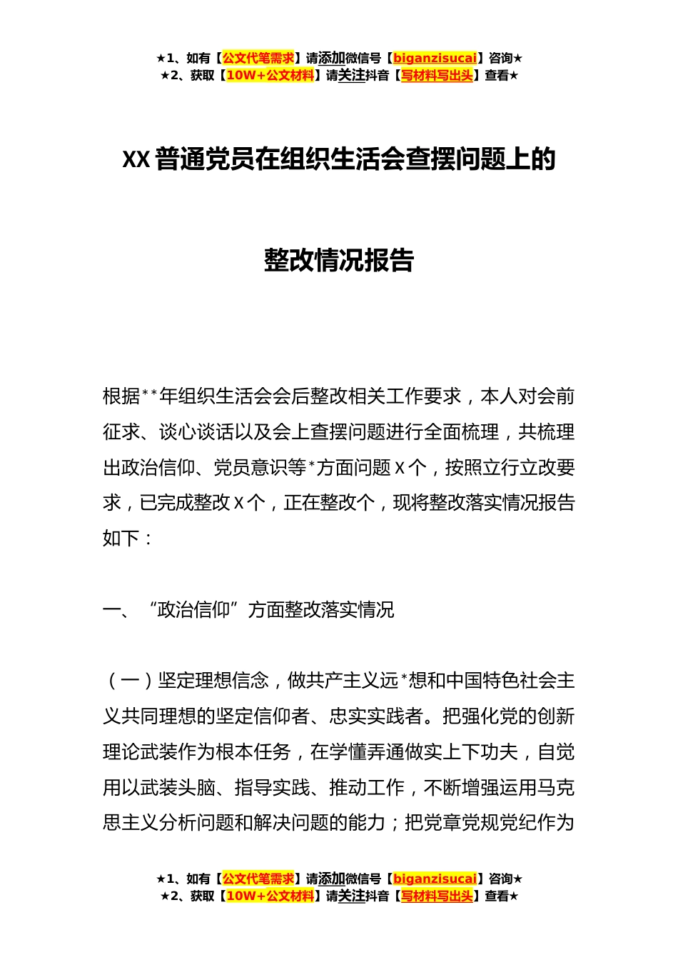 ★1、如有【公文代笔需求】请添加微信号【biganzisucai】咨询★★2、获取【10W+公文材料】请关注抖音【写材料写出头】查看★XX普通党员在组织生活会查摆问题上的整改情况报告根据**年组织生活会会后整改相关工作要求,本人对会前征求、谈心谈话以及会上查摆问题进行全面梳理,共梳理出政治信仰、党员意识等*方面问题X个,按照立行立改要求,已完成整改X个,正在整改个,现将整改落实情况报告如下:一、“政治信仰”方面整改落实情况(一)坚定理想信念,做共产主义远*想和中国特色社会主义共同理想的坚定信仰者、忠实实践者。把强化党的创新理论武装作为根本任务,在学懂弄通做实上下功夫,自觉用以武装头脑、指导实践、推动工作,不断增强运用马克思主义分析问题和解决问题的能力;把党章党规党纪作为★1、如有【...