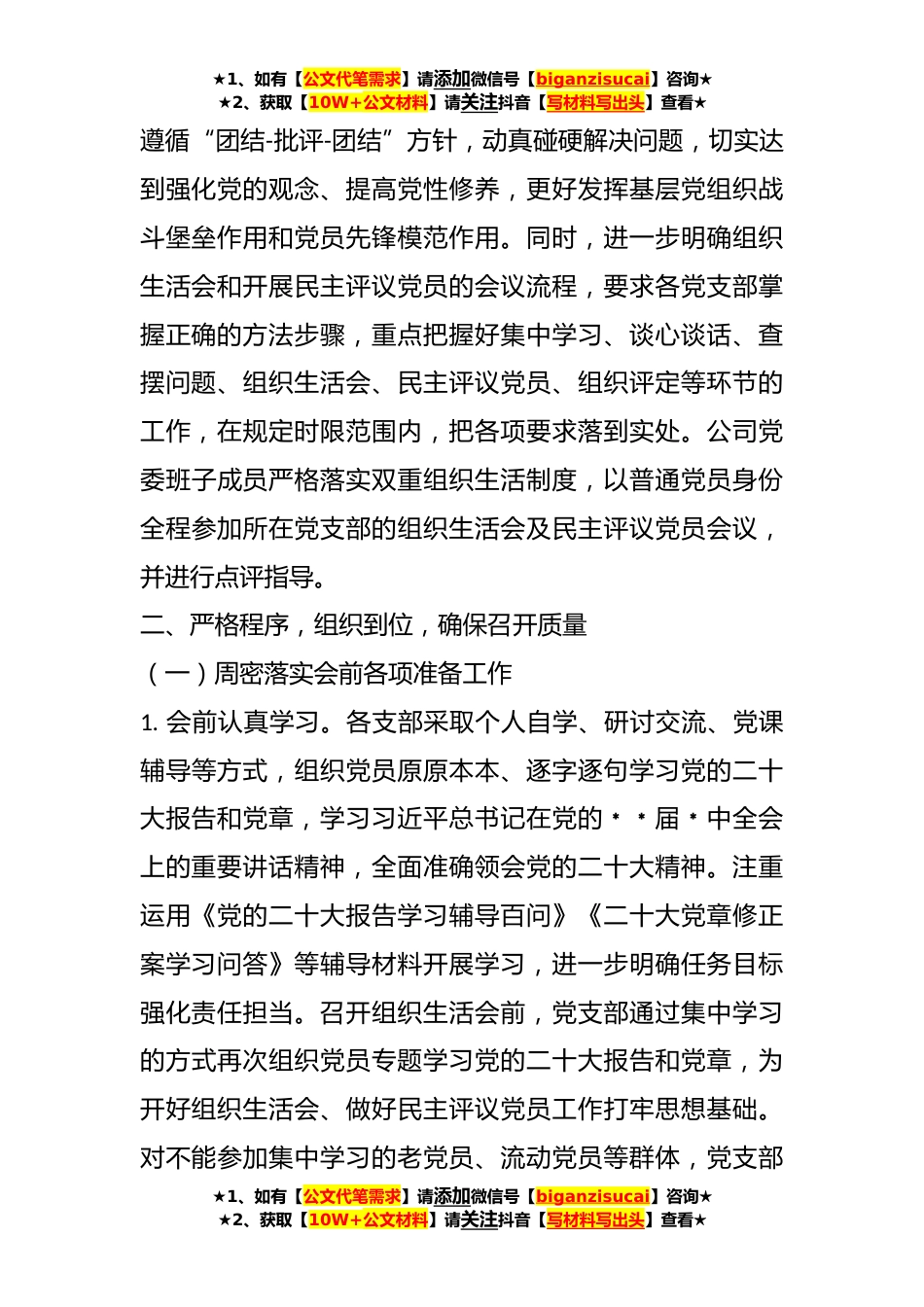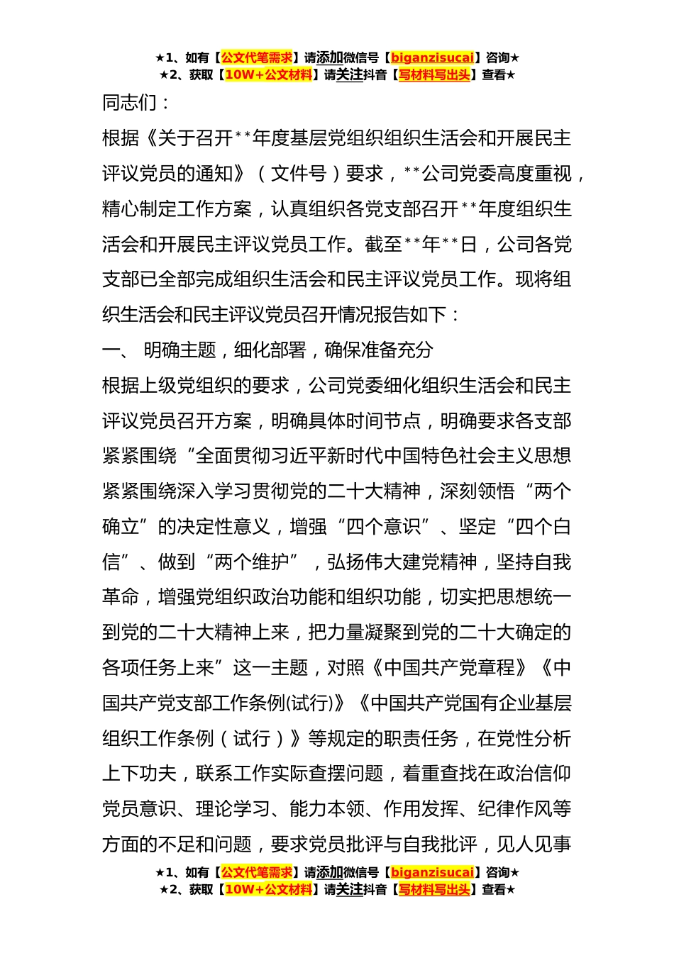 ★1、如有【公文代笔需求】请添加微信号【biganzisucai】咨询★★2、获取【10W+公文材料】请关注抖音【写材料写出头】查看★同志们:根据《关于召开**年度基层党组织组织生活会和开展民主评议党员的通知》(文件号)要求,**公司党委高度重视,精心制定工作方案,认真组织各党支部召开**年度组织生活会和开展民主评议党员工作。截至**年**日,公司各党支部已全部完成组织生活会和民主评议党员工作。现将组织生活会和民主评议党员召开情况报告如下:一、明确主题,细化部署,确保准备充分根据上级党组织的要求,公司党委细化组织生活会和民主评议党员召开方案,明确具体时间节点,明确要求各支部紧紧围绕“全面贯彻习近平新时代中国特色社会主义思想紧紧围绕深入学习贯彻党的二十大精神,深刻领悟“两个确立”的决...