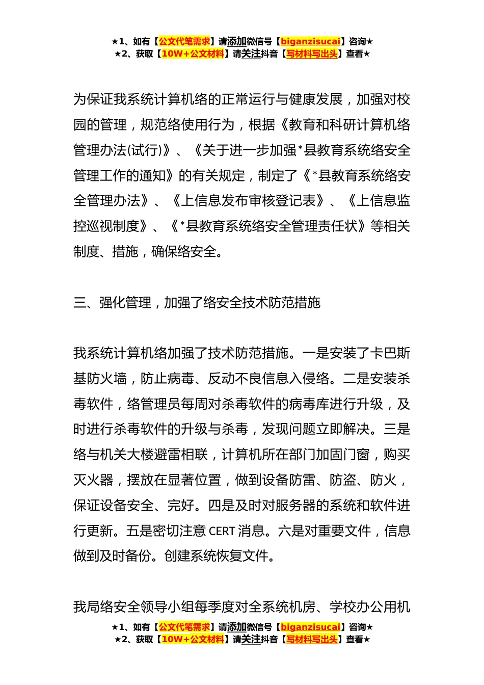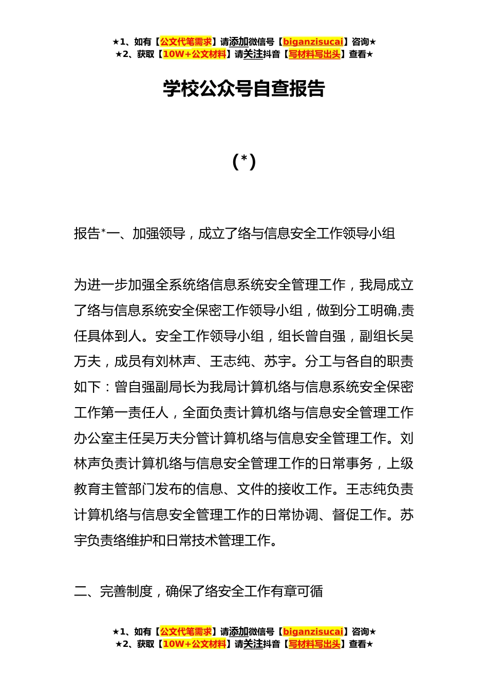 ★1、如有【公文代笔需求】请添加微信号【biganzisucai】咨询★★2、获取【10W+公文材料】请关注抖音【写材料写出头】查看★学校公众号自查报告(*)报告*一、加强领导,成立了络与信息安全工作领导小组为进一步加强全系统络信息系统安全管理工作,我局成立了络与信息系统安全保密工作领导小组,做到分工明确,责任具体到人。安全工作领导小组,组长曾自强,副组长吴万夫,成员有刘林声、王志纯、苏宇。分工与各自的职责如下:曾自强副局长为我局计算机络与信息系统安全保密工作第一责任人,全面负责计算机络与信息安全管理工作办公室主任吴万夫分管计算机络与信息安全管理工作。刘林声负责计算机络与信息安全管理工作的日常事务,上级教育主管部门发布的信息、文件的接收工作。王志纯负责计算机络与信息安全管理工...