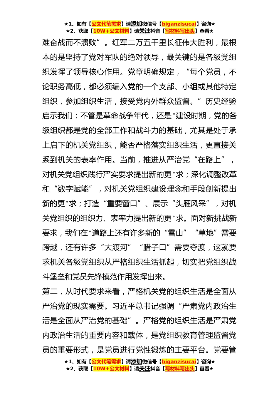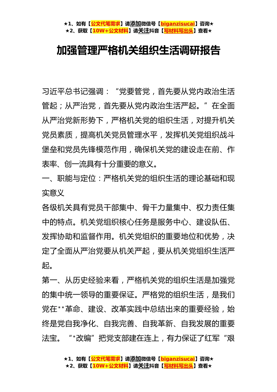 ★1、如有【公文代笔需求】请添加微信号【biganzisucai】咨询★★2、获取【10W+公文材料】请关注抖音【写材料写出头】查看★加强管理严格机关组织生活调研报告习近平总书记强调:“党要管党,首先要从党内政治生活管起;从严治党,首先要从党内政治生活严起。”在全面从严治党新形势下,严格机关党的组织生活,对提升机关党员素质,提高机关党员管理水平,发挥机关党组织战斗堡垒和党员先锋模范作用,确保机关党的建设走在前、作表率、创一流具有十分重要的意义。一、职能与定位:严格机关党的组织生活的理论基础和现实意义各级机关具有党员干部集中、骨干力量集中、权力责任集中的特点。机关党组织核心任务是服务中心、建设队伍、发挥协助和监督作用。机关党组织的重要地位和优势,决定了全面从严治党要从机关严...