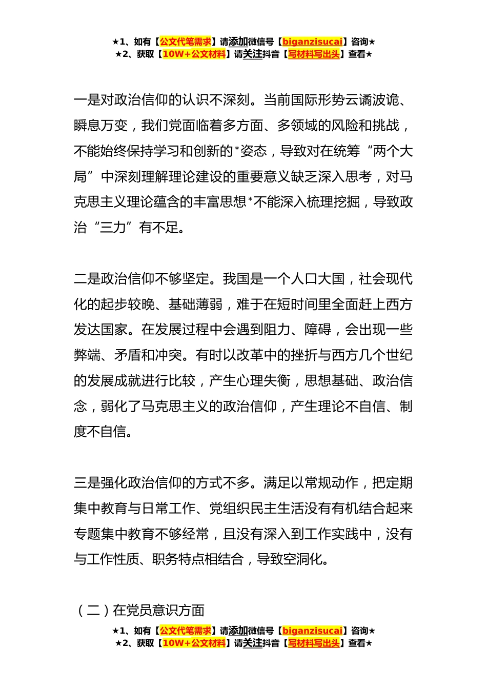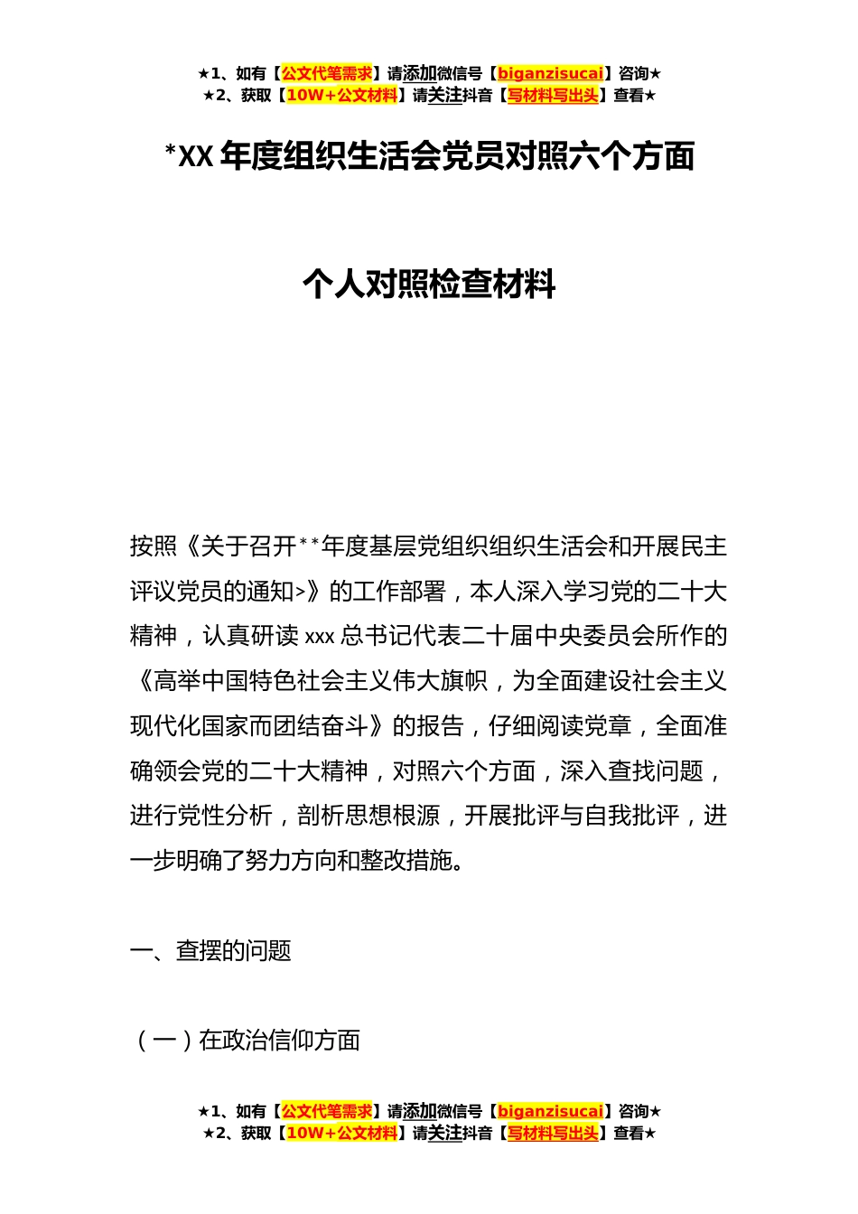 ★1、如有【公文代笔需求】请添加微信号【biganzisucai】咨询★★2、获取【10W+公文材料】请关注抖音【写材料写出头】查看★*XX年度组织生活会党员对照六个方面个人对照检查材料按照《关于召开**年度基层党组织组织生活会和开展民主评议党员的通知>》的工作部署,本人深入学习党的二十大精神,认真研读xxx总书记代表二十届中央委员会所作的《高举中国特色社会主义伟大旗帜,为全面建设社会主义现代化国家而团结奋斗》的报告,仔细阅读党章,全面准确领会党的二十大精神,对照六个方面,深入查找问题,进行党性分析,剖析思想根源,开展批评与自我批评,进一步明确了努力方向和整改措施。一、查摆的问题(一)在政治信仰方面★1、如有【公文代笔需求】请添加微信号【biganzisucai】咨询★★2、获取【10W+公文材料】...