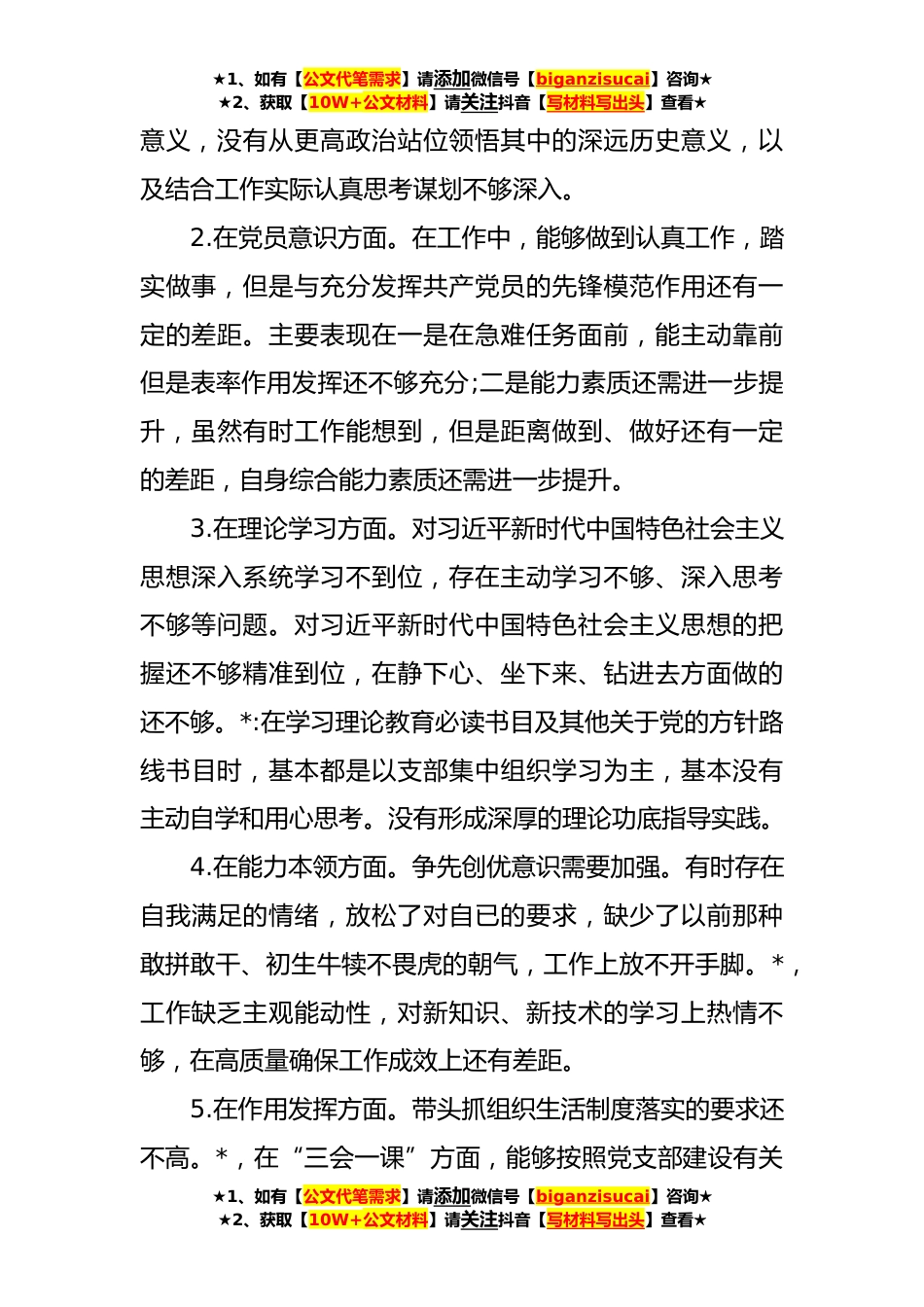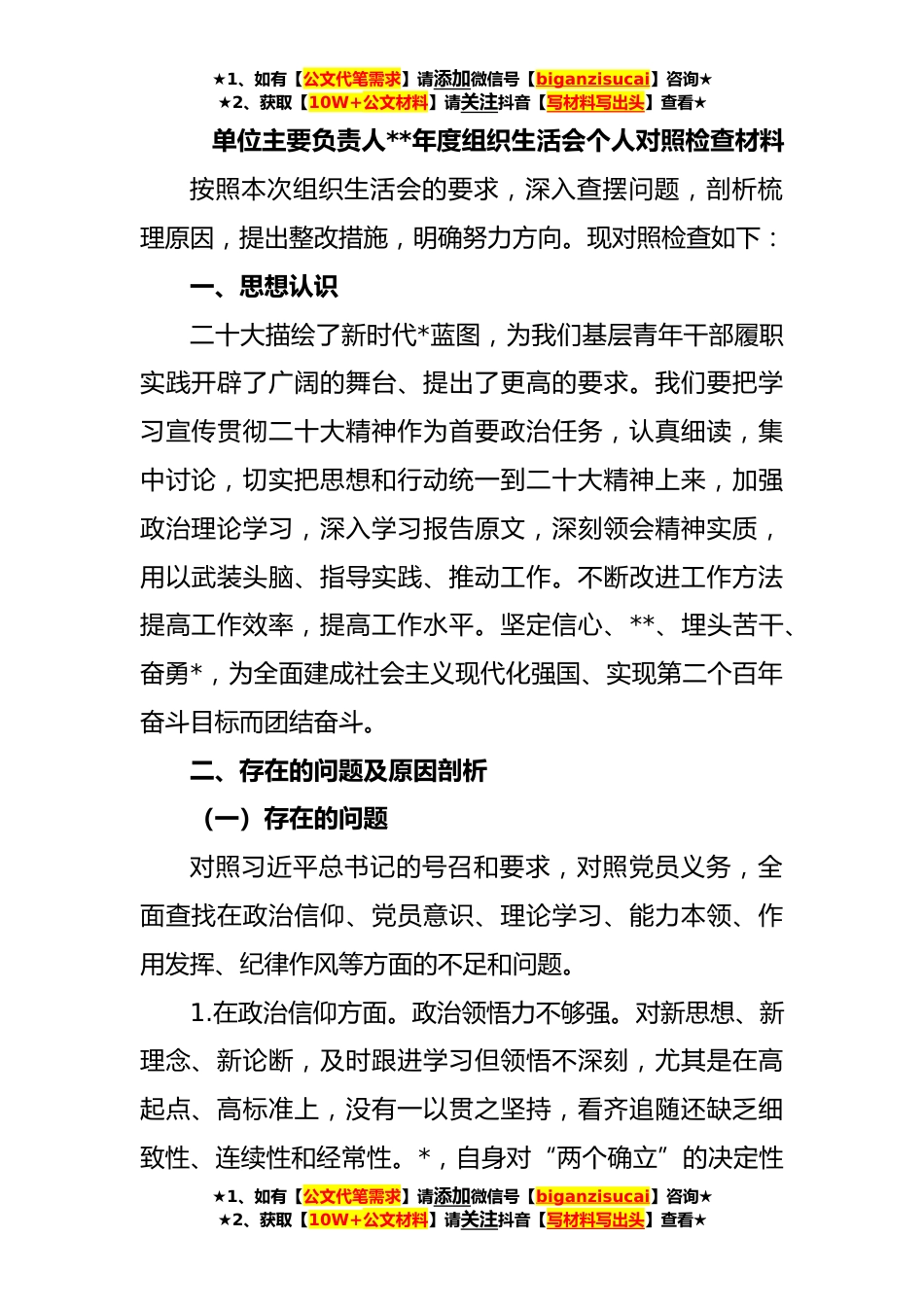 ★1、如有【公文代笔需求】请添加微信号【biganzisucai】咨询★★2、获取【10W+公文材料】请关注抖音【写材料写出头】查看★单位主要负责人**年度组织生活会个人对照检查材料按照本次组织生活会的要求,深入查摆问题,剖析梳理原因,提出整改措施,明确努力方向。现对照检查如下:一、思想认识二十大描绘了新时代*蓝图,为我们基层青年干部履职实践开辟了广阔的舞台、提出了更高的要求。我们要把学习宣传贯彻二十大精神作为首要政治任务,认真细读,集中讨论,切实把思想和行动统一到二十大精神上来,加强政治理论学习,深入学习报告原文,深刻领会精神实质,用以武装头脑、指导实践、推动工作。不断改进工作方法提高工作效率,提高工作水平。坚定信心、**、埋头苦干、奋勇*,为全面建成社会主义现代化强国、实现...