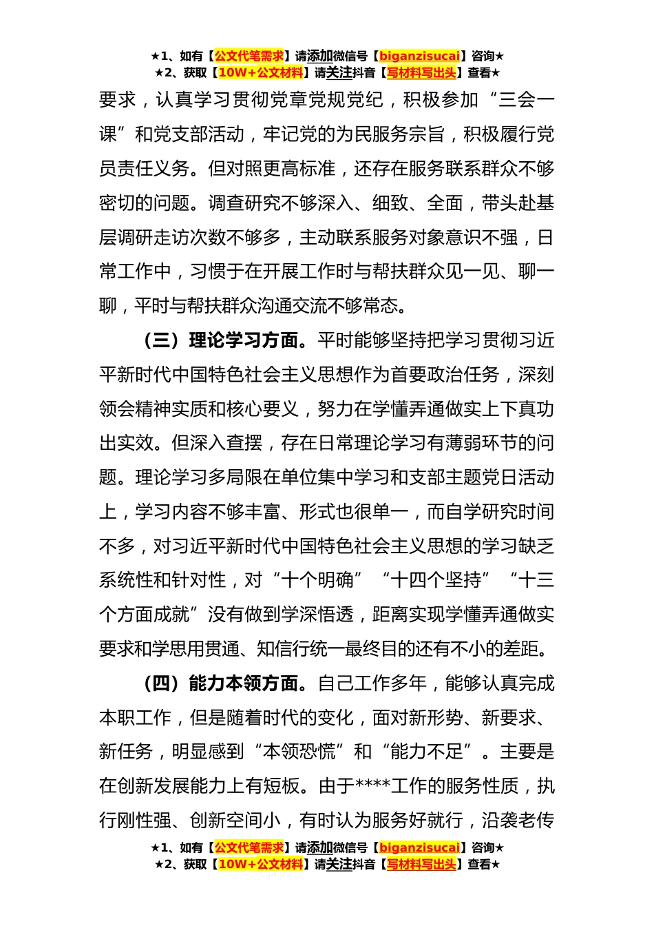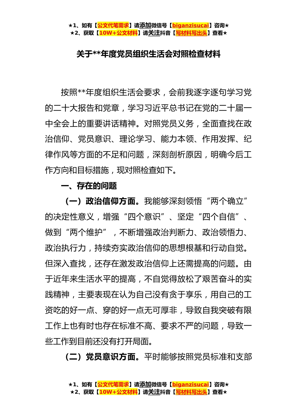 ★1、如有【公文代笔需求】请添加微信号【biganzisucai】咨询★★2、获取【10W+公文材料】请关注抖音【写材料写出头】查看★关于**年度党员组织生活会对照检查材料按照**年度组织生活会要求,会前我逐字逐句学习党的二十大报告和党章,学习习近平总书记在党的二十届一中全会上的重要讲话精神。对照党员义务,全面查找在政治信仰、党员意识、理论学习、能力本领、作用发挥、纪律作风等方面的不足和问题,深刻剖析原因,明确今后工作方向和目标措施,现对照检查如下。一、存在的问题(一)政治信仰方面。我能够深刻领悟“两个确立”的决定性意义,增强“四个意识”、坚定“四个自信”、做到“两个维护”,不断增强政治判断力、政治领悟力、政治执行力,持续夯实政治信仰的思想根基和行动自觉。但深入查找,还存在激...