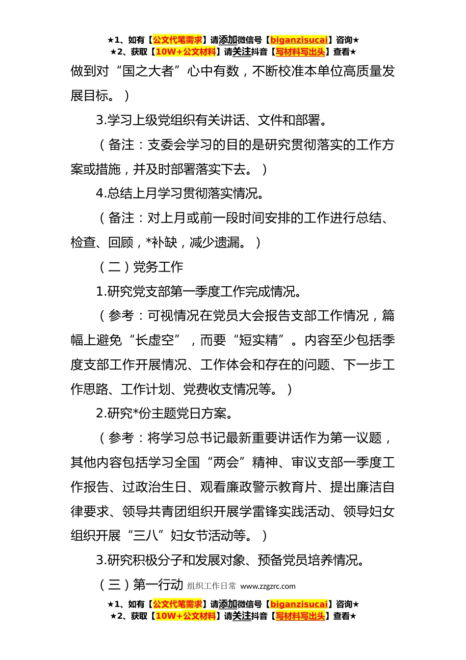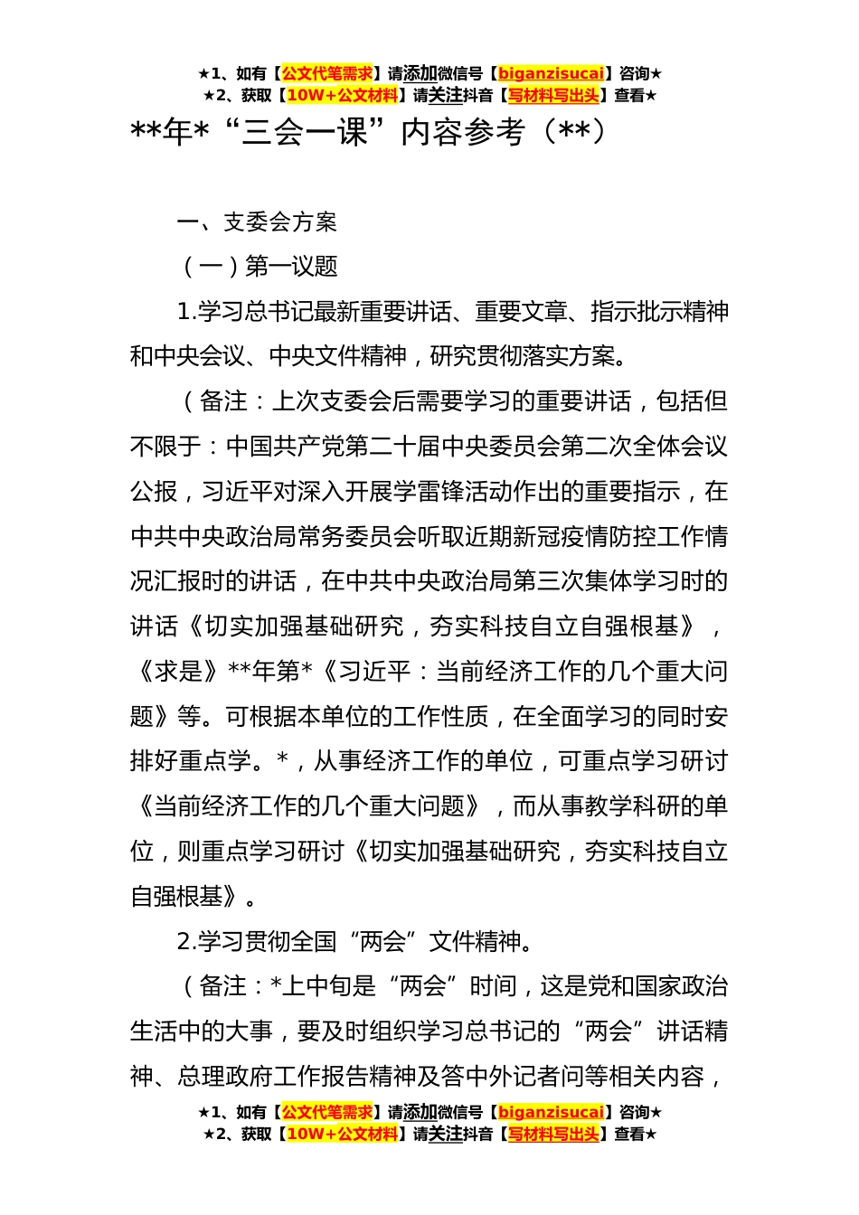 ★1、如有【公文代笔需求】请添加微信号【biganzisucai】咨询★★2、获取【10W+公文材料】请关注抖音【写材料写出头】查看★**年*“三会一课”内容参考(**)一、支委会方案(一)第一议题1.学习总书记最新重要讲话、重要文章、指示批示精神和中央会议、中央文件精神,研究贯彻落实方案。(备注:上次支委会后需要学习的重要讲话,包括但不限于:中国共产党第二十届中央委员会第二次全体会议公报,习近平对深入开展学雷锋活动作出的重要指示,在中共中央政治局常务委员会听取近期新冠疫情防控工作情况汇报时的讲话,在中共中央政治局第三次集体学习时的讲话《切实加强基础研究,夯实科技自立自强根基》,《求是》**年第*《习近平:当前经济工作的几个重大问题》等。可根据本单位的工作性质,在全面学习的同时安排...
