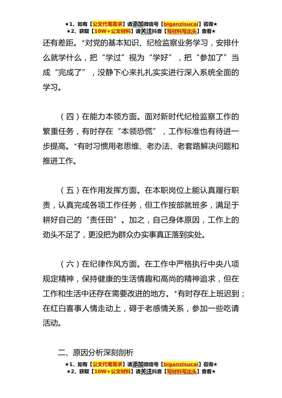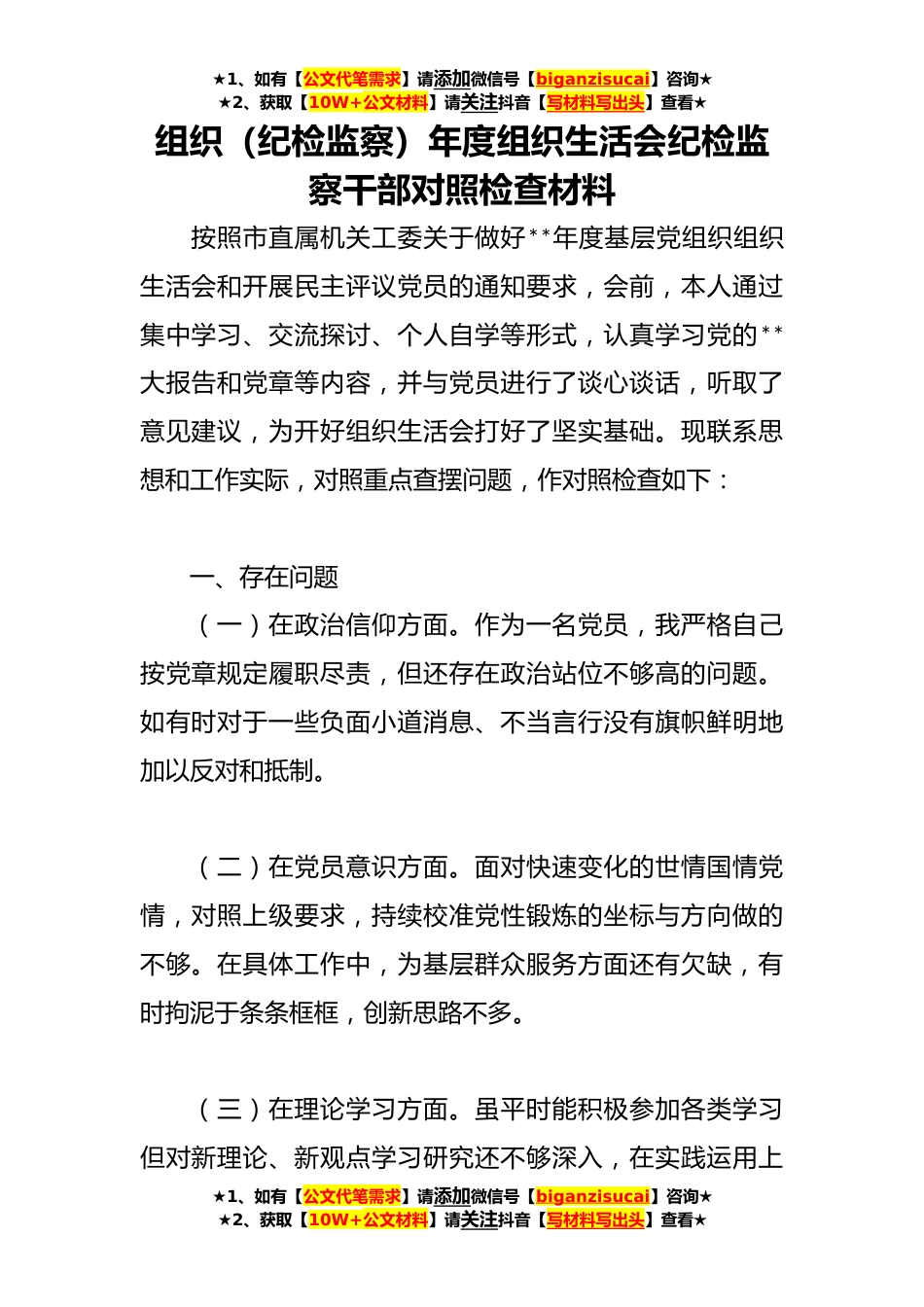 ★1、如有【公文代笔需求】请添加微信号【biganzisucai】咨询★★2、获取【10W+公文材料】请关注抖音【写材料写出头】查看★组织(纪检监察)年度组织生活会纪检监察干部对照检查材料按照市直属机关工委关于做好**年度基层党组织组织生活会和开展民主评议党员的通知要求,会前,本人通过集中学习、交流探讨、个人自学等形式,认真学习党的**大报告和党章等内容,并与党员进行了谈心谈话,听取了意见建议,为开好组织生活会打好了坚实基础。现联系思想和工作实际,对照重点查摆问题,作对照检查如下:一、存在问题(一)在政治信仰方面。作为一名党员,我严格自己按党章规定履职尽责,但还存在政治站位不够高的问题。如有时对于一些负面小道消息、不当言行没有旗帜鲜明地加以反对和抵制。(二)在党员意识方面。面...