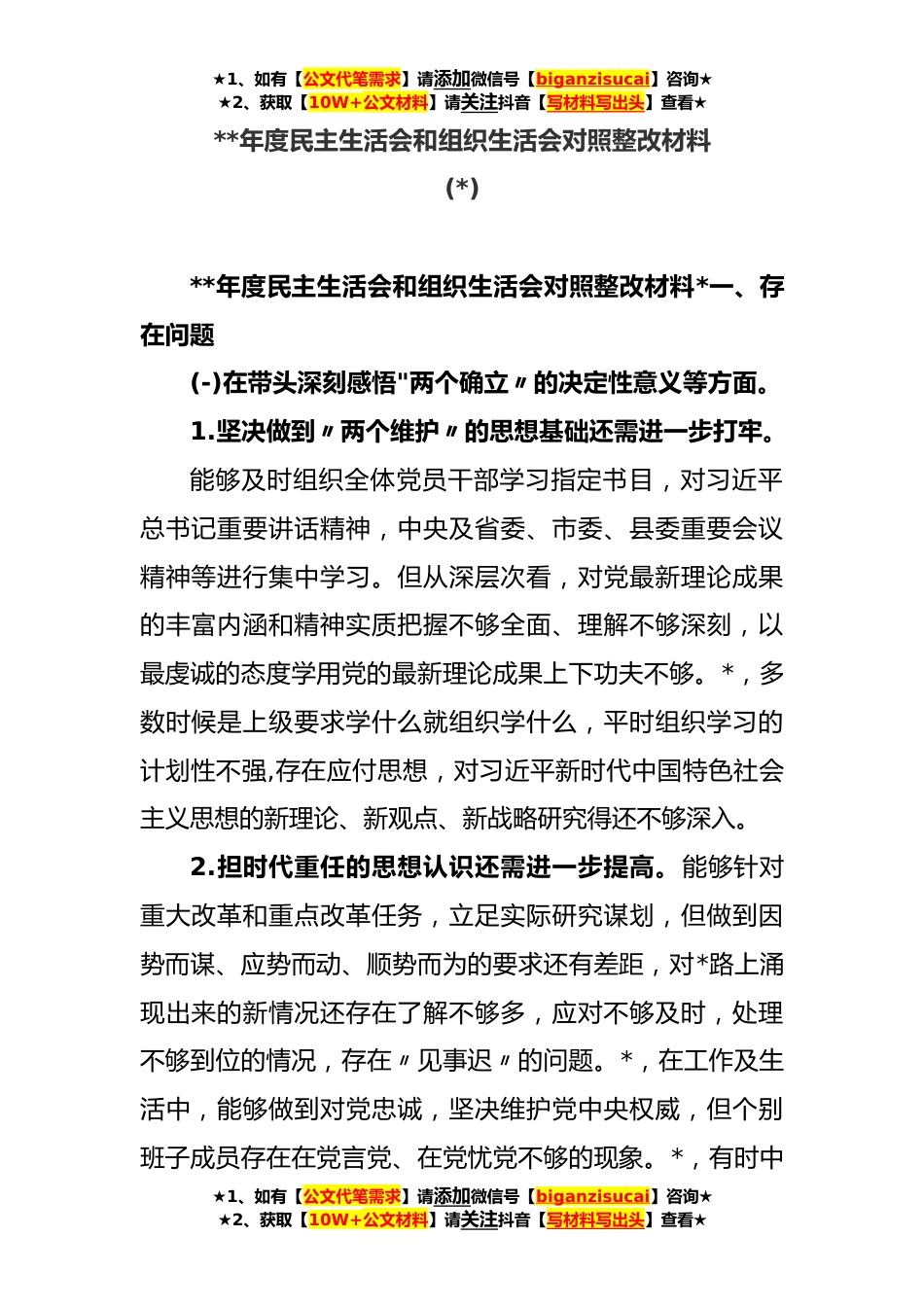 ★1、如有【公文代笔需求】请添加微信号【biganzisucai】咨询★★2、获取【10W+公文材料】请关注抖音【写材料写出头】查看★**年度民主生活会和组织生活会对照整改材料(*)**年度民主生活会和组织生活会对照整改材料*一、存在问题(-)在带头深刻感悟"两个确立〃的决定性意义等方面。1.坚决做到〃两个维护〃的思想基础还需进一步打牢。能够及时组织全体党员干部学习指定书目,对习近平总书记重要讲话精神,中央及省委、市委、县委重要会议精神等进行集中学习。但从深层次看,对党最新理论成果的丰富内涵和精神实质把握不够全面、理解不够深刻,以最虔诚的态度学用党的最新理论成果上下功夫不够。*,多数时候是上级要求学什么就组织学什么,平时组织学习的计划性不强,存在应付思想,对习近平新时代中国特色社会主义思...