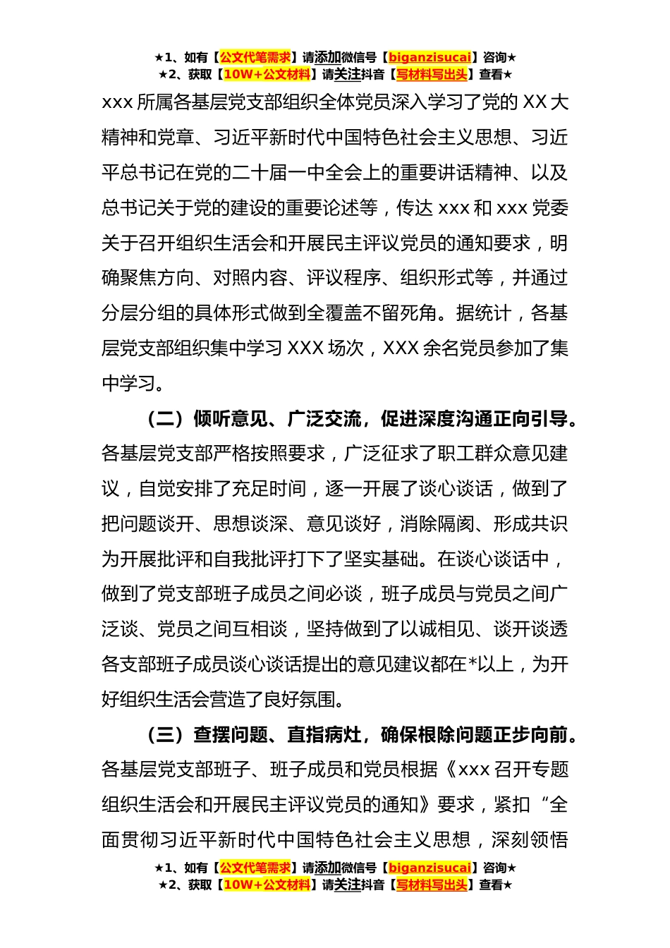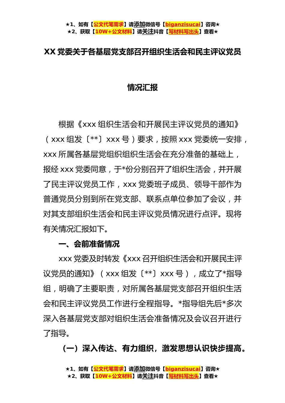 ★1、如有【公文代笔需求】请添加微信号【biganzisucai】咨询★★2、获取【10W+公文材料】请关注抖音【写材料写出头】查看★XX党委关于各基层党支部召开组织生活会和民主评议党员情况汇报根据《xxx组织生活会和开展民主评议党员的通知》(xxx组发〔**〕xxx号)要求,按照xxx党委统一安排,xxx所属各基层党组织组织生活会在充分准备的基础上,报经xxx党委同意,于*份分别召开了组织生活会,并开展了民主评议党员工作,xxx党委班子成员、领导干部作为普通党员分别到所在党支部、联系点单位参加了会议,并对其支部组织生活会和民主评议党员情况进行点评。现将有关情况汇报如下。一、会前准备情况xxx党委及时转发《xxx召开组织生活会和开展民主评议党员的通知》(xxx组发〔**〕xxx号),成立了*指导组,明确了主要职责...