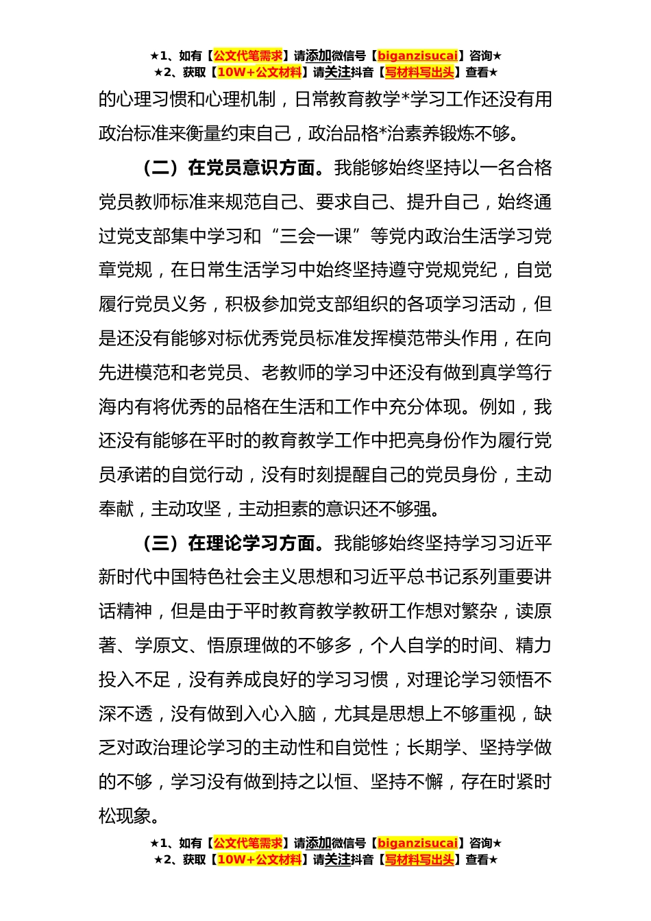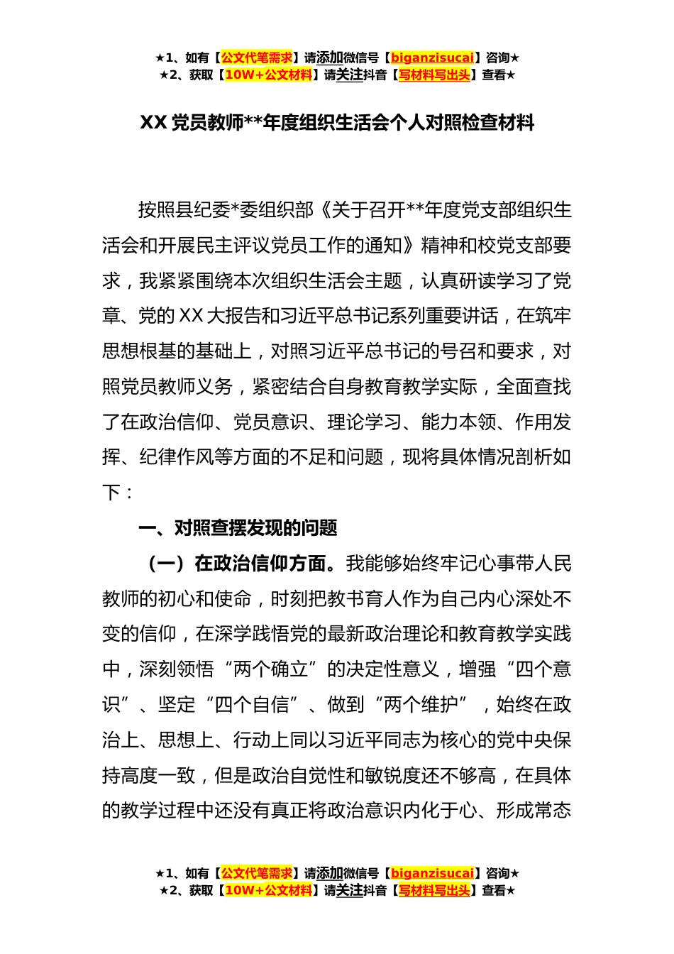 ★1、如有【公文代笔需求】请添加微信号【biganzisucai】咨询★★2、获取【10W+公文材料】请关注抖音【写材料写出头】查看★XX党员教师**年度组织生活会个人对照检查材料按照县纪委*委组织部《关于召开**年度党支部组织生活会和开展民主评议党员工作的通知》精神和校党支部要求,我紧紧围绕本次组织生活会主题,认真研读学习了党章、党的XX大报告和习近平总书记系列重要讲话,在筑牢思想根基的基础上,对照习近平总书记的号召和要求,对照党员教师义务,紧密结合自身教育教学实际,全面查找了在政治信仰、党员意识、理论学习、能力本领、作用发挥、纪律作风等方面的不足和问题,现将具体情况剖析如下:一、对照查摆发现的问题(一)在政治信仰方面。我能够始终牢记心事带人民教师的初心和使命,时刻把教书育人作为...