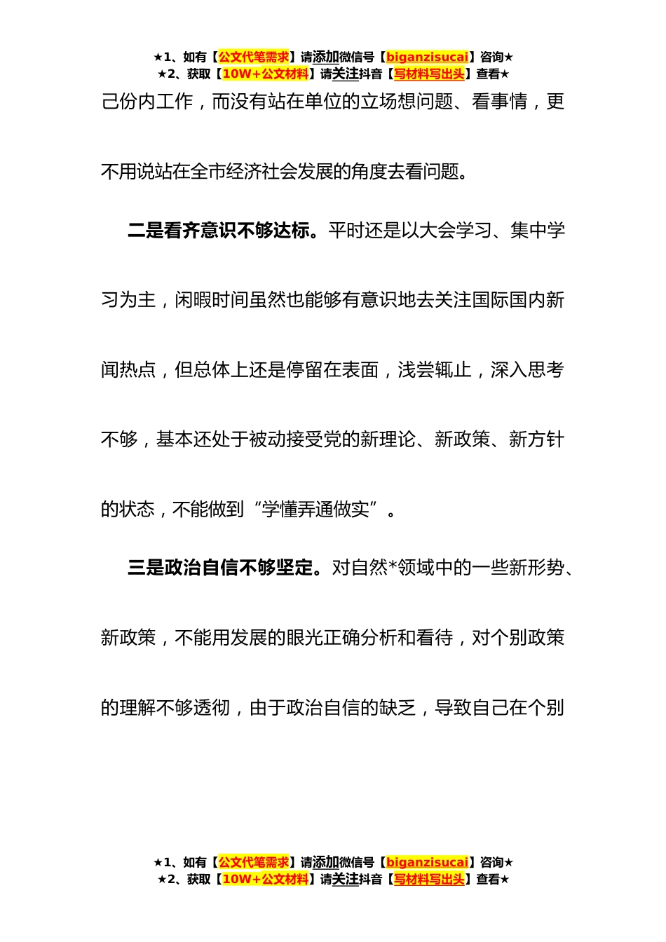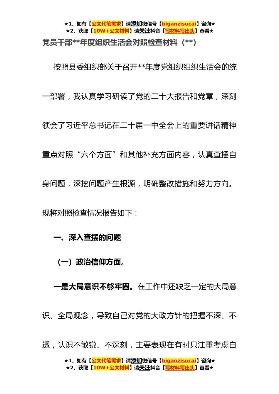 ★1、如有【公文代笔需求】请添加微信号【biganzisucai】咨询★★2、获取【10W+公文材料】请关注抖音【写材料写出头】查看★党员干部**年度组织生活会对照检查材料(**)按照县委组织部关于召开**年度党组织组织生活会的统一部署,我认真学习研读了党的二十大报告和党章,深刻领会了习近平总书记在二十届一中全会上的重要讲话精神重点对照“六个方面”和其他补充方面内容,认真查摆自身问题,深挖问题产生根源,明确整改措施和努力方向。现将对照检查情况报告如下:一、深入查摆的问题(一)政治信仰方面。一是大局意识不够牢固。在工作中还缺乏一定的大局意识、全局观念,导致自己对党的大政方针的把握不深、不透,认识不敏锐、不深刻,主要表现在有时只注重考虑自★1、如有【公文代笔需求】请添加微信号【biganz...