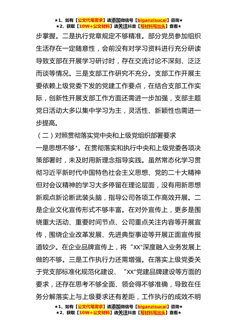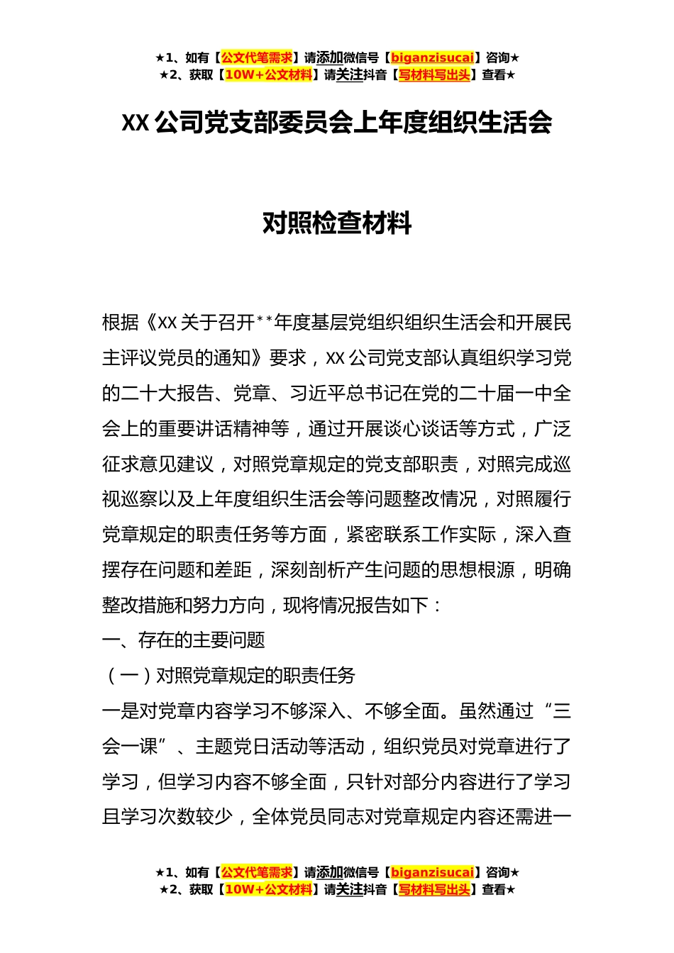 ★1、如有【公文代笔需求】请添加微信号【biganzisucai】咨询★★2、获取【10W+公文材料】请关注抖音【写材料写出头】查看★XX公司党支部委员会上年度组织生活会对照检查材料根据《XX关于召开**年度基层党组织组织生活会和开展民主评议党员的通知》要求,XX公司党支部认真组织学习党的二十大报告、党章、习近平总书记在党的二十届一中全会上的重要讲话精神等,通过开展谈心谈话等方式,广泛征求意见建议,对照党章规定的党支部职责,对照完成巡视巡察以及上年度组织生活会等问题整改情况,对照履行党章规定的职责任务等方面,紧密联系工作实际,深入查摆存在问题和差距,深刻剖析产生问题的思想根源,明确整改措施和努力方向,现将情况报告如下:一、存在的主要问题(一)对照党章规定的职责任务一是对党章内容学...