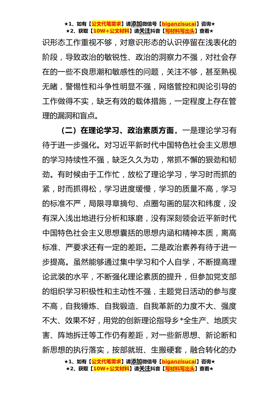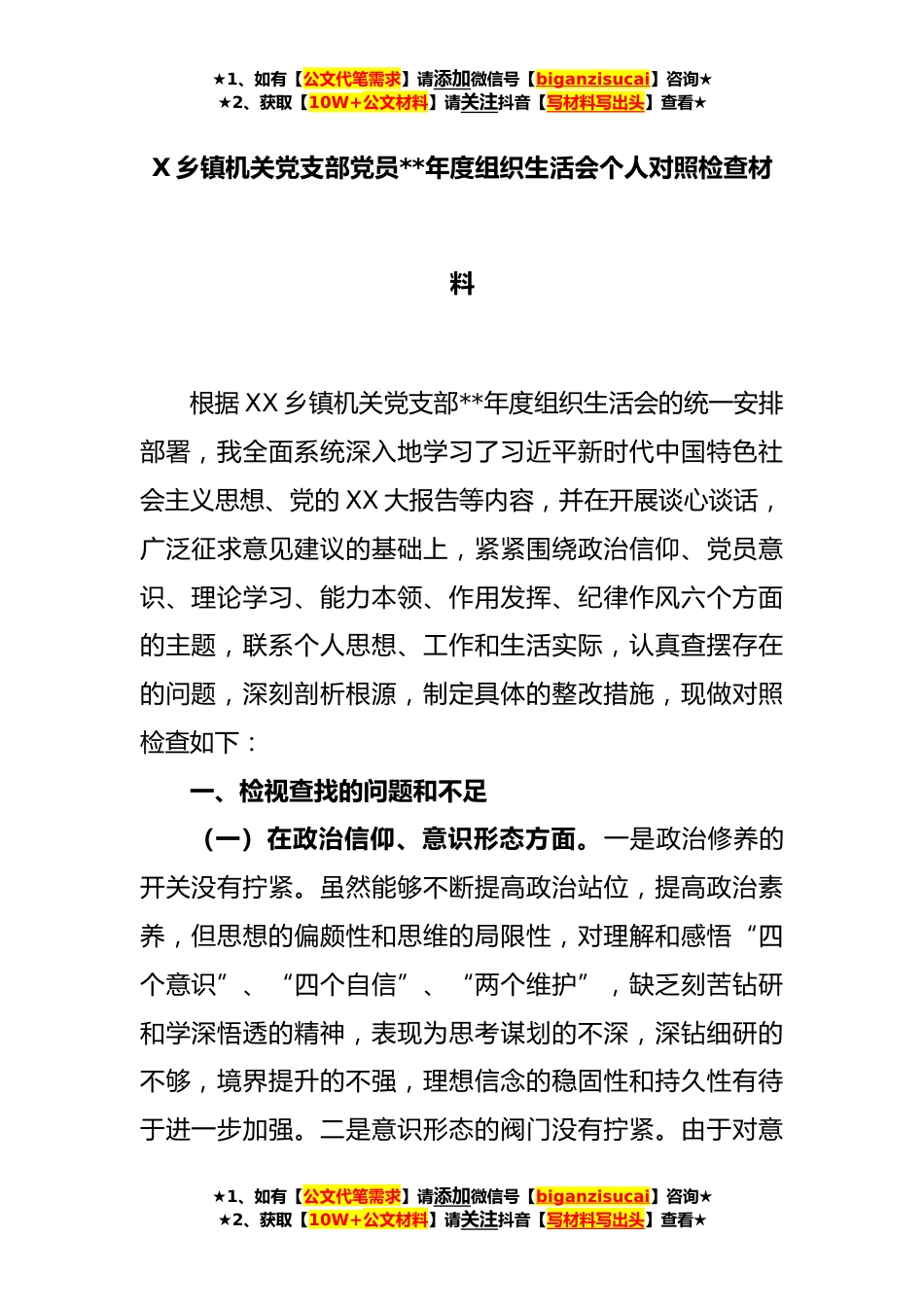★1、如有【公文代笔需求】请添加微信号【biganzisucai】咨询★★2、获取【10W+公文材料】请关注抖音【写材料写出头】查看★X乡镇机关党支部党员**年度组织生活会个人对照检查材料根据XX乡镇机关党支部**年度组织生活会的统一安排部署,我全面系统深入地学习了习近平新时代中国特色社会主义思想、党的XX大报告等内容,并在开展谈心谈话,广泛征求意见建议的基础上,紧紧围绕政治信仰、党员意识、理论学习、能力本领、作用发挥、纪律作风六个方面的主题,联系个人思想、工作和生活实际,认真查摆存在的问题,深刻剖析根源,制定具体的整改措施,现做对照检查如下:一、检视查找的问题和不足(一)在政治信仰、意识形态方面。一是政治修养的开关没有拧紧。虽然能够不断提高政治站位,提高政治素养,但思想的偏颇性和...