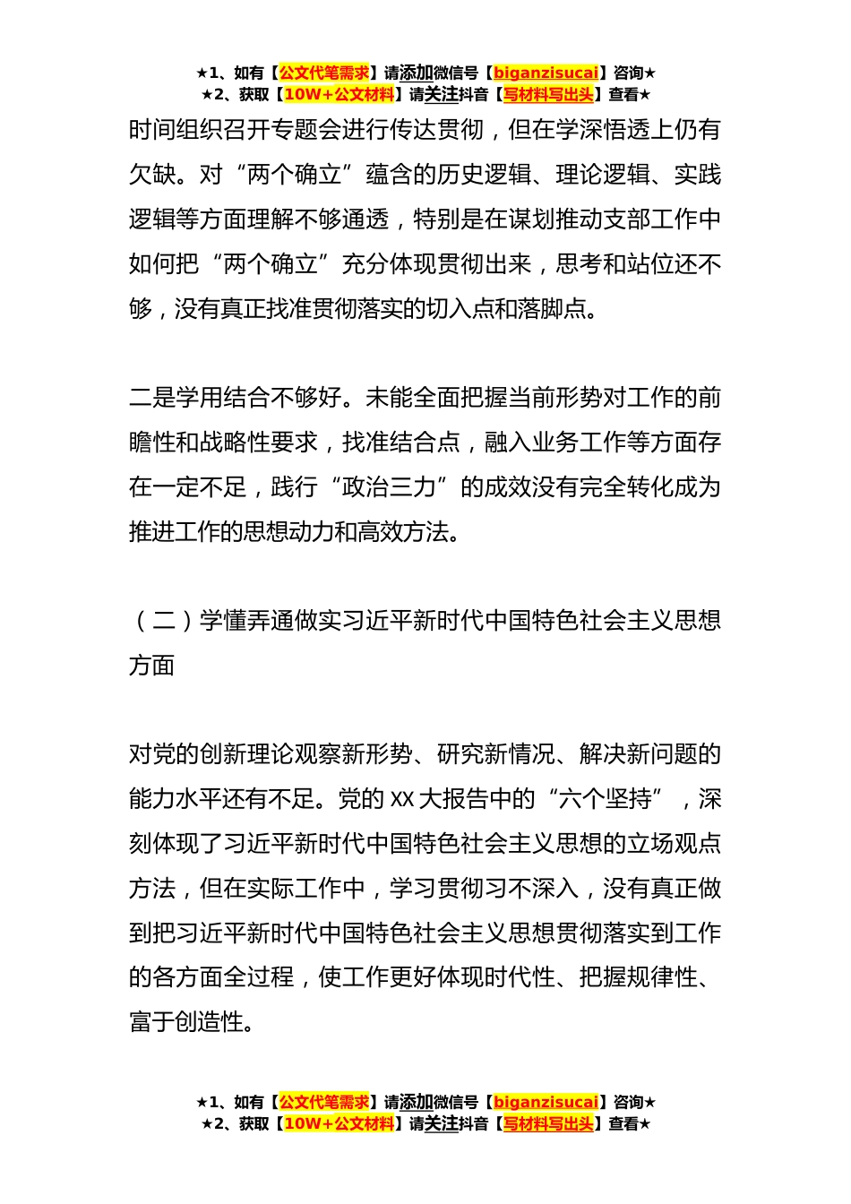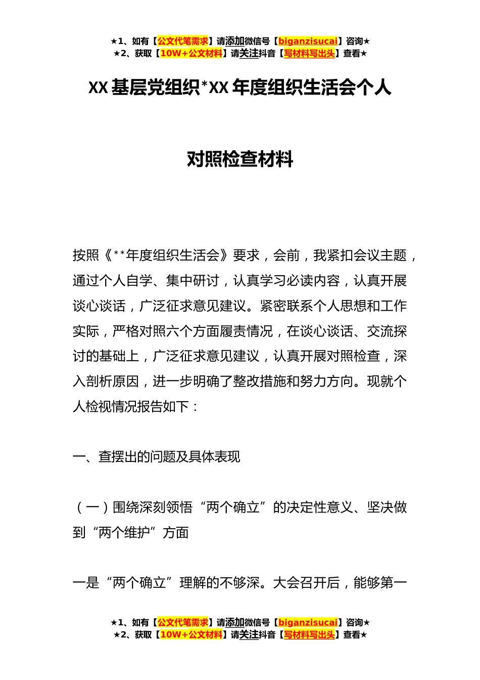 ★1、如有【公文代笔需求】请添加微信号【biganzisucai】咨询★★2、获取【10W+公文材料】请关注抖音【写材料写出头】查看★XX基层党组织*XX年度组织生活会个人对照检查材料按照《**年度组织生活会》要求,会前,我紧扣会议主题,通过个人自学、集中研讨,认真学习必读内容,认真开展谈心谈话,广泛征求意见建议。紧密联系个人思想和工作实际,严格对照六个方面履责情况,在谈心谈话、交流探讨的基础上,广泛征求意见建议,认真开展对照检查,深入剖析原因,进一步明确了整改措施和努力方向。现就个人检视情况报告如下:一、查摆出的问题及具体表现(一)围绕深刻领悟“两个确立”的决定性意义、坚决做到“两个维护”方面一是“两个确立”理解的不够深。大会召开后,能够第一★1、如有【公文代笔需求】请添加微信...