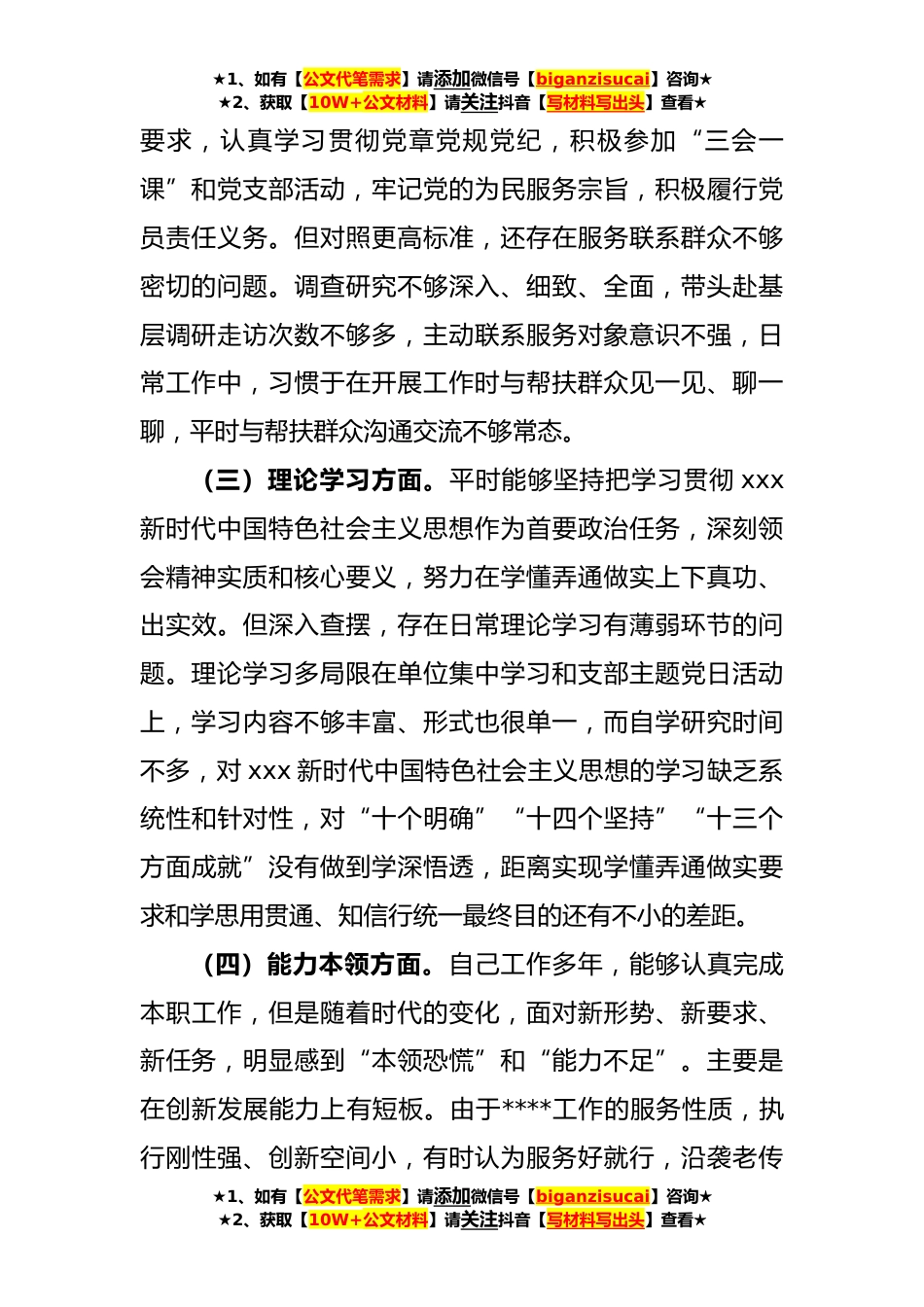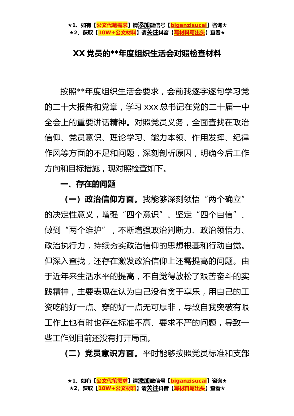 ★1、如有【公文代笔需求】请添加微信号【biganzisucai】咨询★★2、获取【10W+公文材料】请关注抖音【写材料写出头】查看★XX党员的**年度组织生活会对照检查材料按照**年度组织生活会要求,会前我逐字逐句学习党的二十大报告和党章,学习xxx总书记在党的二十届一中全会上的重要讲话精神。对照党员义务,全面查找在政治信仰、党员意识、理论学习、能力本领、作用发挥、纪律作风等方面的不足和问题,深刻剖析原因,明确今后工作方向和目标措施,现对照检查如下。一、存在的问题(一)政治信仰方面。我能够深刻领悟“两个确立”的决定性意义,增强“四个意识”、坚定“四个自信”、做到“两个维护”,不断增强政治判断力、政治领悟力、政治执行力,持续夯实政治信仰的思想根基和行动自觉。但深入查找,还存在激发政...