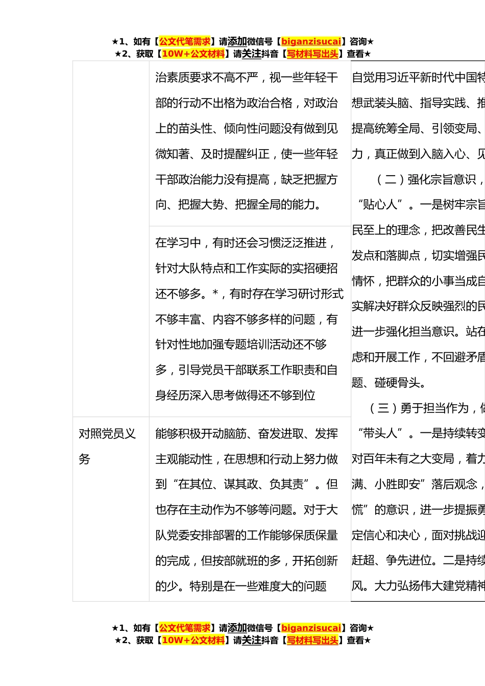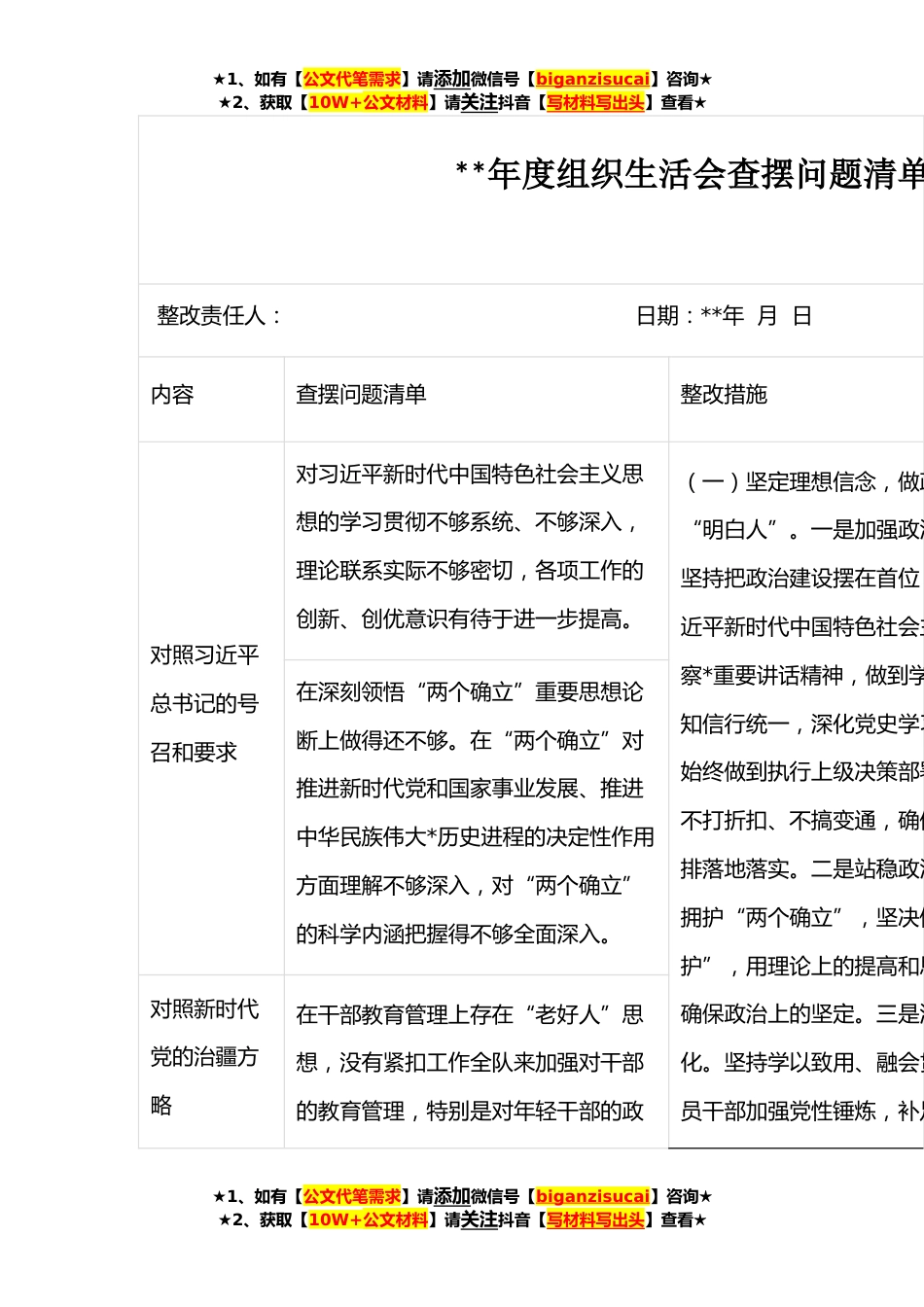 ★1、如有【公文代笔需求】请添加微信号【biganzisucai】咨询★★2、获取【10W+公文材料】请关注抖音【写材料写出头】查看★**年度组织生活会查摆问题清单整改责任人:日期:**年月日内容查摆问题清单整改措施对照习近平总书记的号召和要求对习近平新时代中国特色社会主义思想的学习贯彻不够系统、不够深入,理论联系实际不够密切,各项工作的创新、创优意识有待于进一步提高。(一)坚定理想信念,做政“明白人”。一是加强政治坚持把政治建设摆在首位近平新时代中国特色社会主察*重要讲话精神,做到学知信行统一,深化党史学习始终做到执行上级决策部署不打折扣、不搞变通,确保排落地落实。二是站稳政治拥护“两个确立”,坚决做护”,用理论上的提高和思确保政治上的坚定。三是注化。坚持学以致用、融会贯员干...