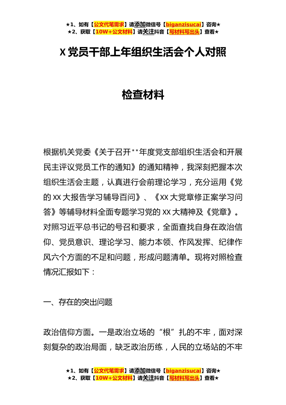 ★1、如有【公文代笔需求】请添加微信号【biganzisucai】咨询★★2、获取【10W+公文材料】请关注抖音【写材料写出头】查看★X党员干部上年组织生活会个人对照检查材料根据机关党委《关于召开**年度党支部组织生活会和开展民主评议党员工作的通知》的通知精神,我深刻把握本次组织生活会主题,认真进行会前理论学习,充分运用《党的XX大报告学习辅导百问》、《XX大党章修正案学习问答》等辅导材料全面专题学习党的XX大精神及《党章》。对照习近平总书记的号召和要求,全面查找自身在政治信仰、党员意识、理论学习、能力本领、作风发挥、纪律作风六个方面的不足和问题,形成问题清单。现将对照检查情况汇报如下:一、存在的突出问题政治信仰方面。一是政治立场的“根”扎的不牢,面对深刻复杂的政治局面,缺乏政治历...