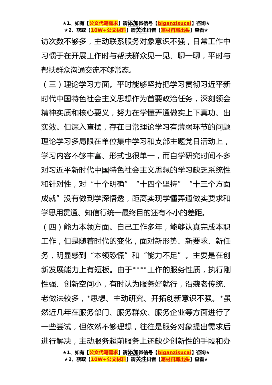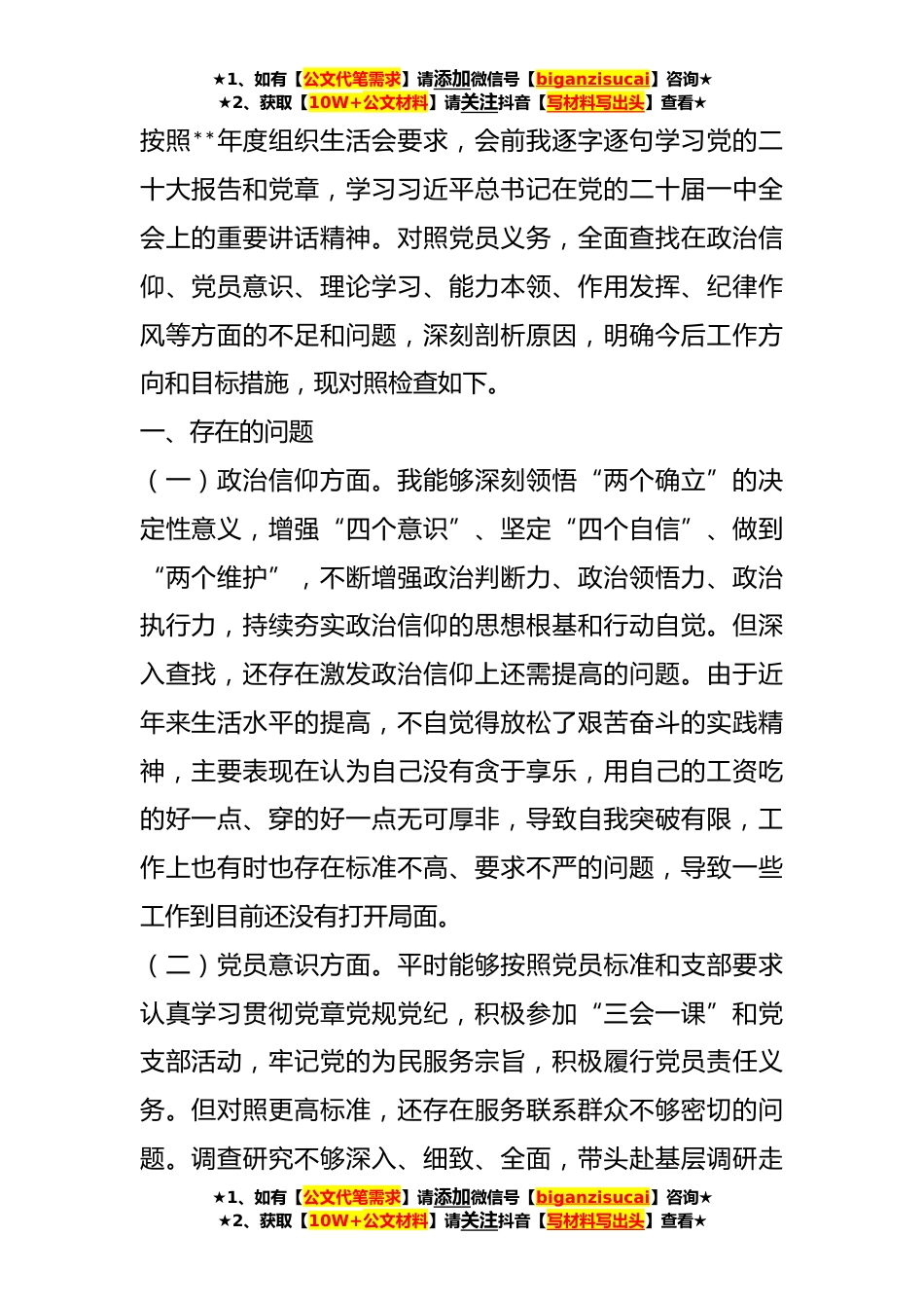 ★1、如有【公文代笔需求】请添加微信号【biganzisucai】咨询★★2、获取【10W+公文材料】请关注抖音【写材料写出头】查看★按照**年度组织生活会要求,会前我逐字逐句学习党的二十大报告和党章,学习习近平总书记在党的二十届一中全会上的重要讲话精神。对照党员义务,全面查找在政治信仰、党员意识、理论学习、能力本领、作用发挥、纪律作风等方面的不足和问题,深刻剖析原因,明确今后工作方向和目标措施,现对照检查如下。一、存在的问题(一)政治信仰方面。我能够深刻领悟“两个确立”的决定性意义,增强“四个意识”、坚定“四个自信”、做到“两个维护”,不断增强政治判断力、政治领悟力、政治执行力,持续夯实政治信仰的思想根基和行动自觉。但深入查找,还存在激发政治信仰上还需提高的问题。由于近年...