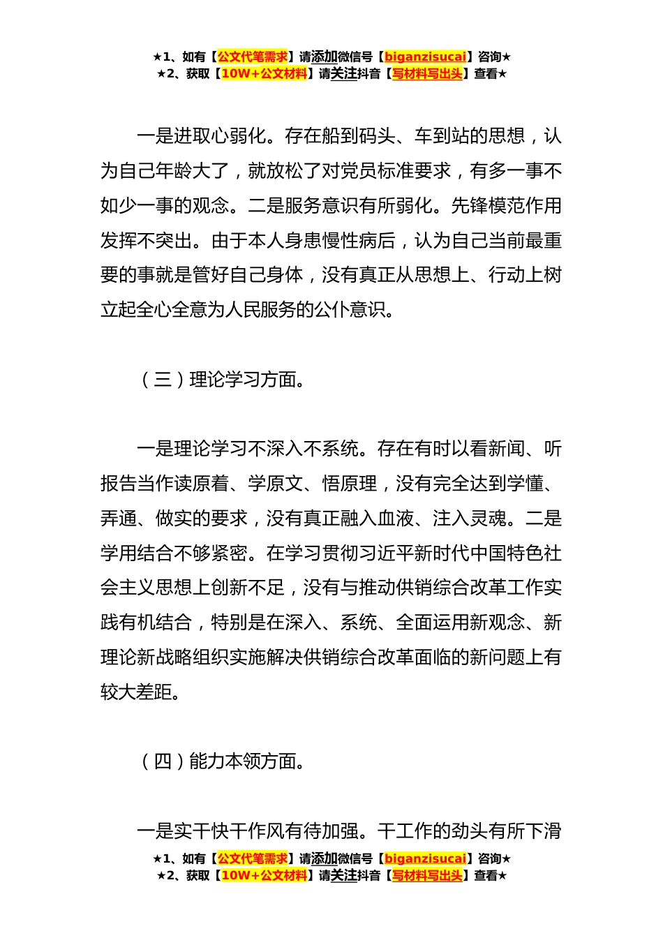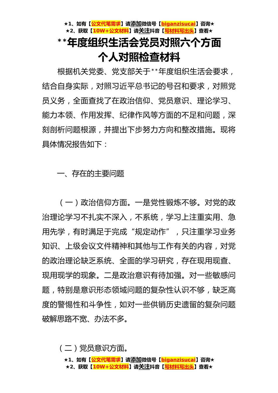 ★1、如有【公文代笔需求】请添加微信号【biganzisucai】咨询★★2、获取【10W+公文材料】请关注抖音【写材料写出头】查看★**年度组织生活会党员对照六个方面个人对照检查材料根据机关党委、党支部关于**年度组织生活会要求,结合自身实际,对照习近平总书记的号召和要求,对照党员义务,全面查找了在政治信仰、党员意识、理论学习、能力本领、作用发挥、纪律作风等方面的不足和问题,深刻剖析问题根源,并提出下步努力方向和整改措施。现将具体情况报告如下:一、存在的主要问题(一)政治信仰方面。一是党性锻炼不够。对党的政治理论学习不扎实不深入,不系统,学习上注重实用、急用先学,有时满足于完成“规定动作”,只注重学习业务知识、上级会议文件精神和其他与工作有关的内容,对党的政治理论缺乏系统、...