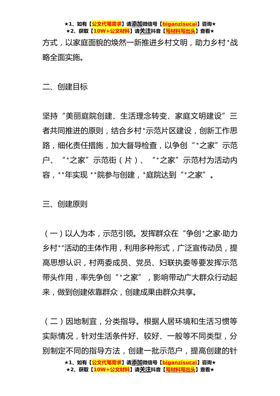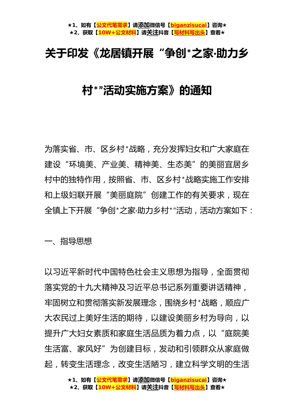 ★1、如有【公文代笔需求】请添加微信号【biganzisucai】咨询★★2、获取【10W+公文材料】请关注抖音【写材料写出头】查看★关于印发《龙居镇开展“争创*之家·助力乡村*”活动实施方案》的通知为落实省、市、区乡村*战略,充分发挥妇女和广大家庭在建设“环境美、产业美、精神美、生态美”的美丽宜居乡村中的独特作用,按照省、市、区乡村*战略实施工作安排和上级妇联开展“美丽庭院”创建工作的有关要求,现在全镇上下开展“争创*之家·助力乡村*”活动,活动方案如下:一、指导思想以习近平新时代中国特色社会主义思想为指导,全面贯彻落实党的十九大精神及习近平总书记系列重要讲话精神,牢固树立和贯彻落实新发展理念,围绕乡村*战略,顺应广大农民过上美好生活的期待,以建设美丽乡村为导向,以提升广大妇女...