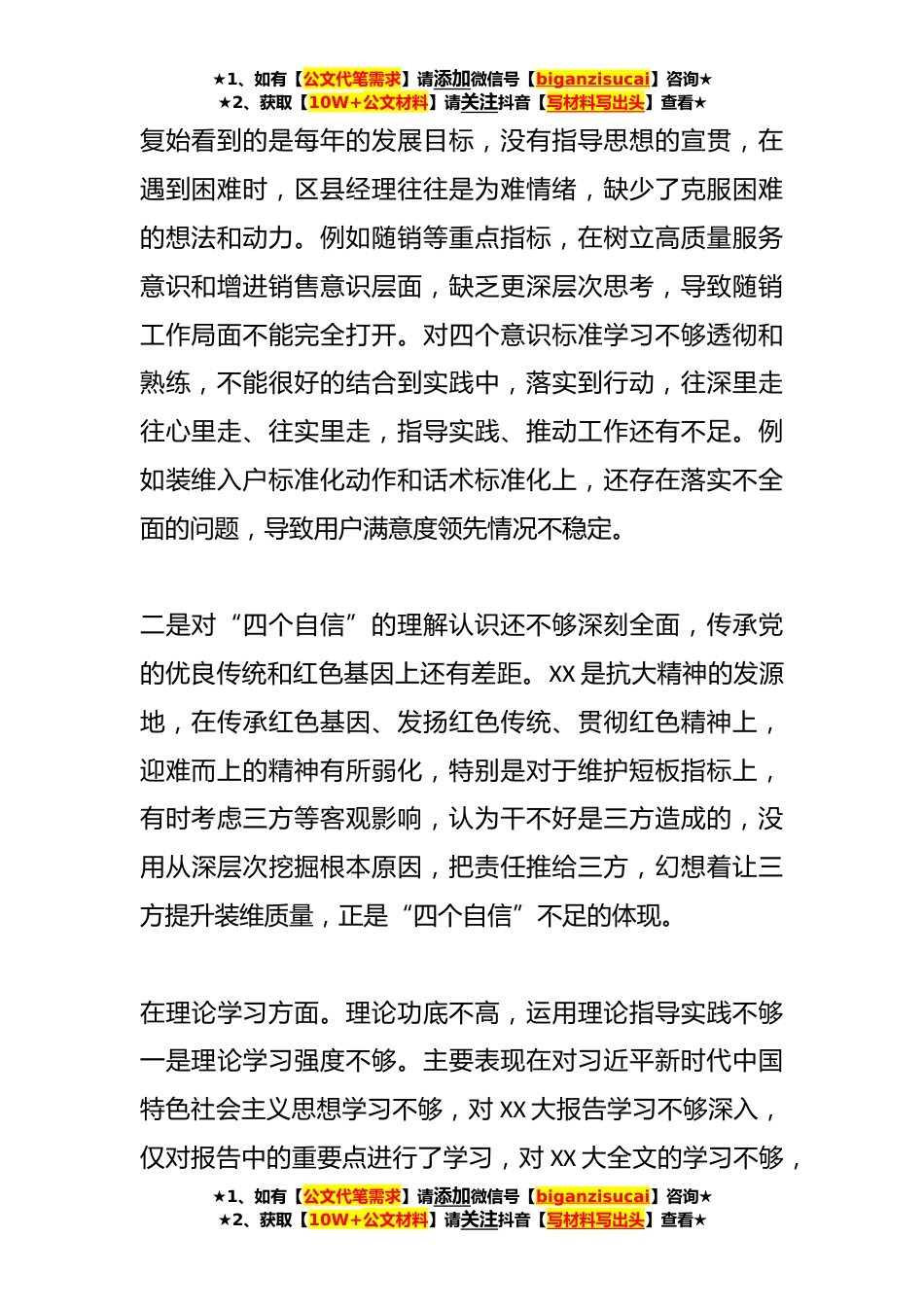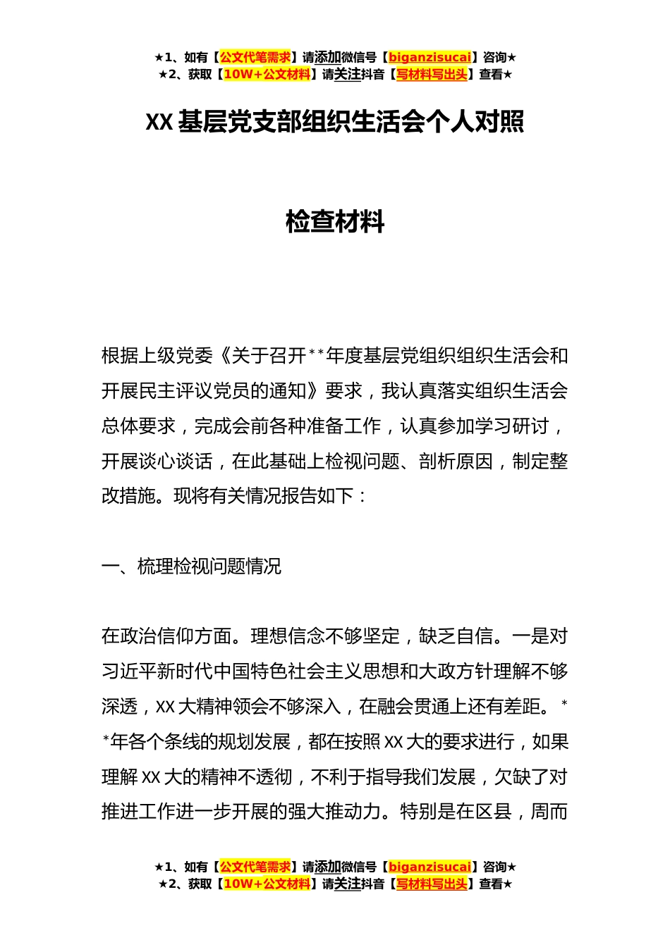 ★1、如有【公文代笔需求】请添加微信号【biganzisucai】咨询★★2、获取【10W+公文材料】请关注抖音【写材料写出头】查看★XX基层党支部组织生活会个人对照检查材料根据上级党委《关于召开**年度基层党组织组织生活会和开展民主评议党员的通知》要求,我认真落实组织生活会总体要求,完成会前各种准备工作,认真参加学习研讨,开展谈心谈话,在此基础上检视问题、剖析原因,制定整改措施。现将有关情况报告如下:一、梳理检视问题情况在政治信仰方面。理想信念不够坚定,缺乏自信。一是对习近平新时代中国特色社会主义思想和大政方针理解不够深透,XX大精神领会不够深入,在融会贯通上还有差距。**年各个条线的规划发展,都在按照XX大的要求进行,如果理解XX大的精神不透彻,不利于指导我们发展,欠缺了对推进工...