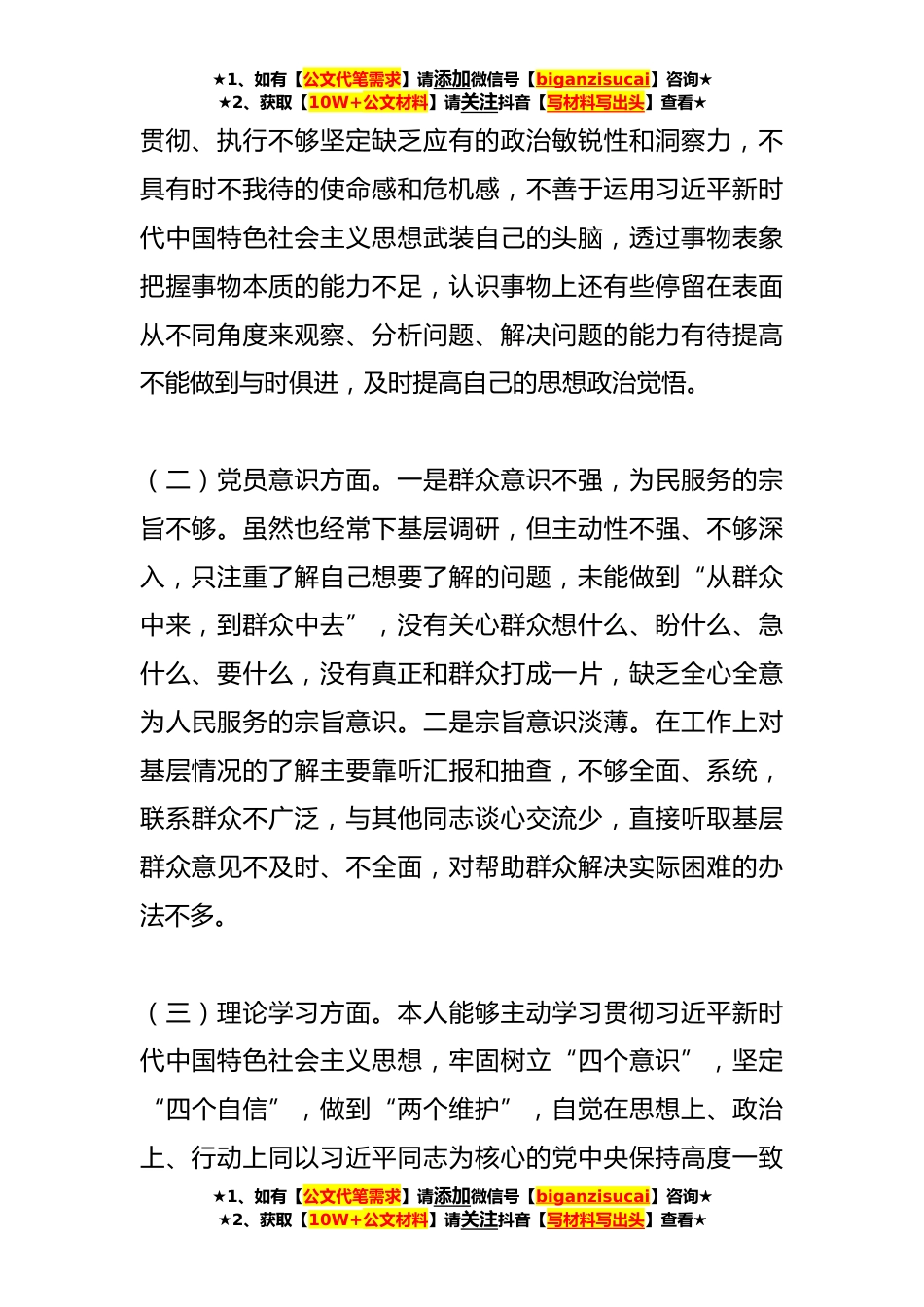 ★1、如有【公文代笔需求】请添加微信号【biganzisucai】咨询★★2、获取【10W+公文材料】请关注抖音【写材料写出头】查看★年度XX党员干部组织生活会个人对照检查材料按照上级对这次组织生活会有关要求,本人结合思想、工作、生活实际,对照政治信仰、党员意识、理论学习、能力本领、作用发挥和纪律作风六个方面深刻剖析自身存在的突出问题,并进行了认真反思产生问题的原因,提出了整改措施。下面我将个人对照检查情况汇报如下:一、对照六个方面查摆的问题(一)政治信仰方面。一是理想信念不够坚定。有时错误的认为理想信念比较抽象,共产主义比较遥远,工作生活中有一定的现实主义和功利主义思想,没有自觉做到像老一辈革命家、优秀共产党员那样为理想信念而奋不顾身地去拼搏、去奋斗、献出自己的全部精力乃...