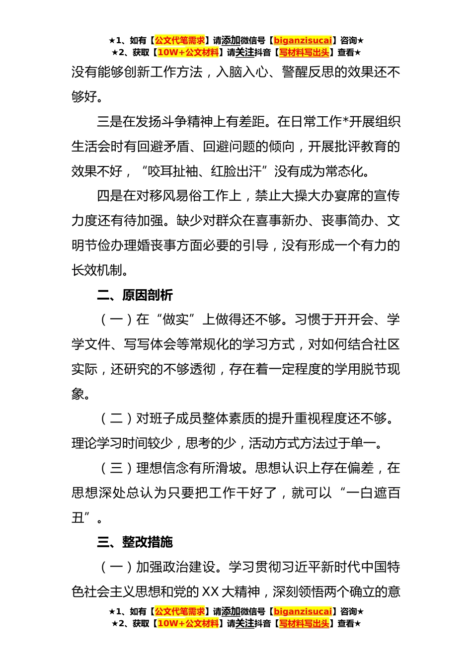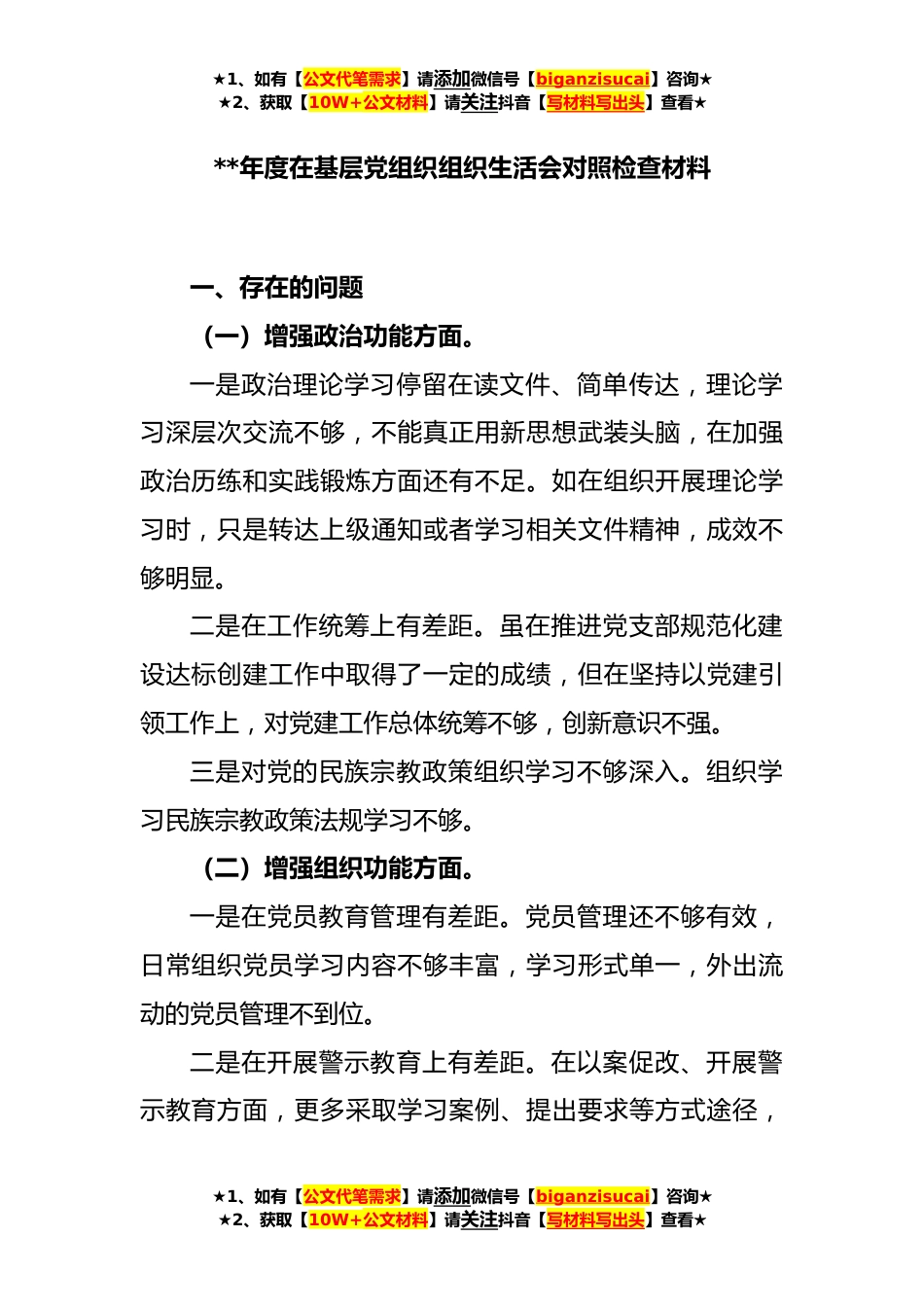 ★1、如有【公文代笔需求】请添加微信号【biganzisucai】咨询★★2、获取【10W+公文材料】请关注抖音【写材料写出头】查看★**年度在基层党组织组织生活会对照检查材料一、存在的问题(一)增强政治功能方面。一是政治理论学习停留在读文件、简单传达,理论学习深层次交流不够,不能真正用新思想武装头脑,在加强政治历练和实践锻炼方面还有不足。如在组织开展理论学习时,只是转达上级通知或者学习相关文件精神,成效不够明显。二是在工作统筹上有差距。虽在推进党支部规范化建设达标创建工作中取得了一定的成绩,但在坚持以党建引领工作上,对党建工作总体统筹不够,创新意识不强。三是对党的民族宗教政策组织学习不够深入。组织学习民族宗教政策法规学习不够。(二)增强组织功能方面。一是在党员教育管理有差...