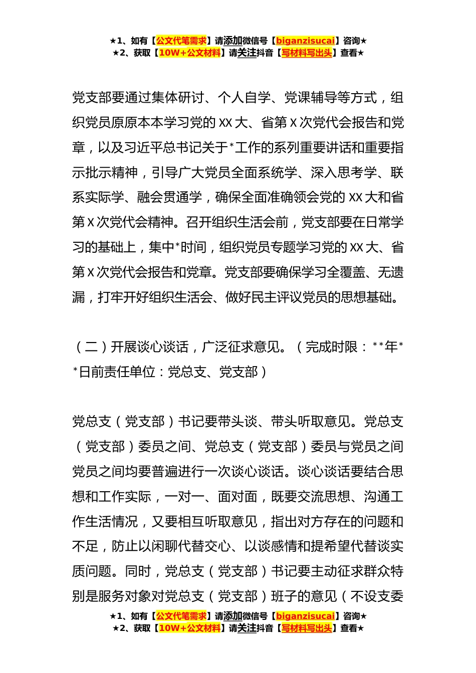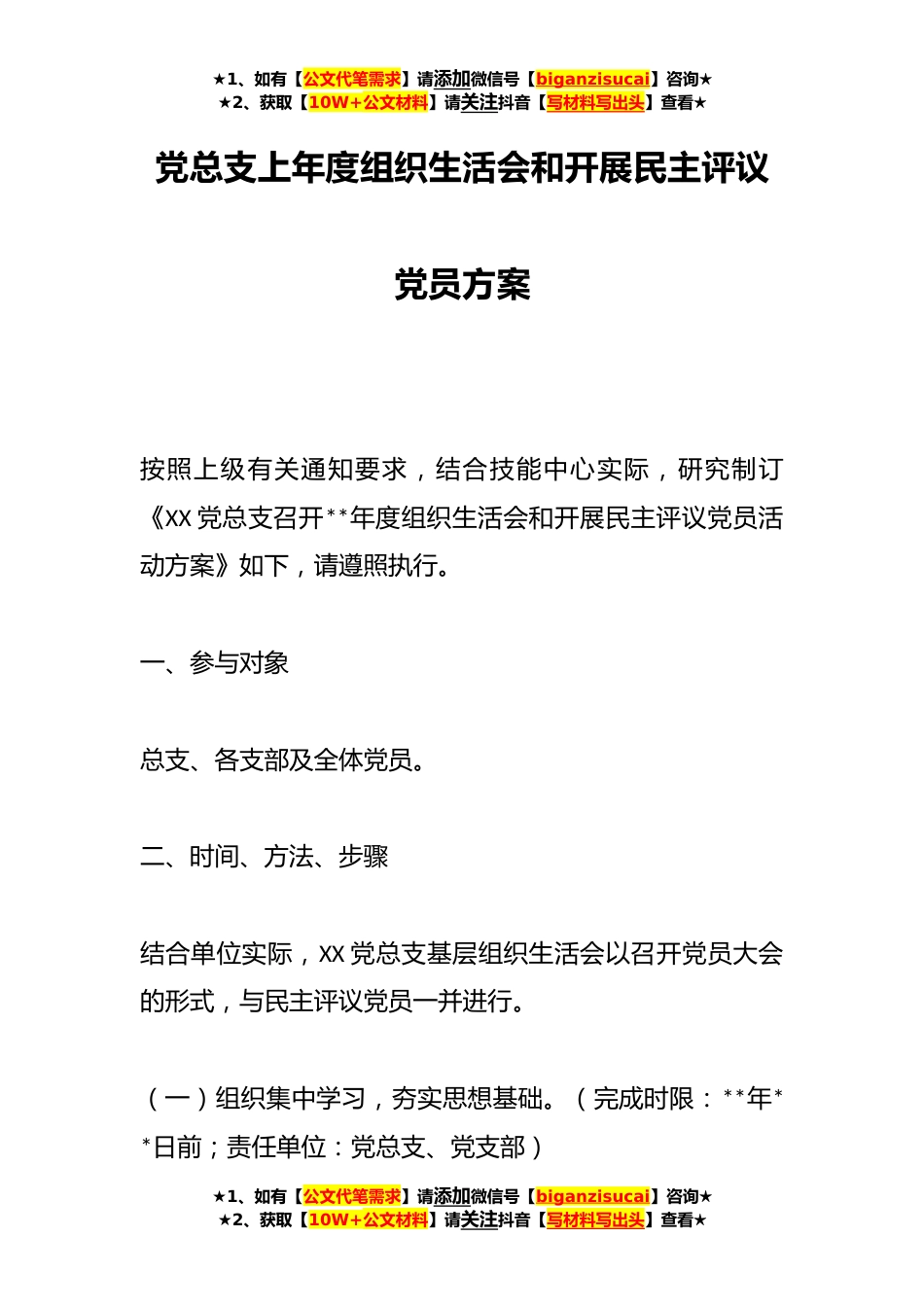 ★1、如有【公文代笔需求】请添加微信号【biganzisucai】咨询★★2、获取【10W+公文材料】请关注抖音【写材料写出头】查看★党总支上年度组织生活会和开展民主评议党员方案按照上级有关通知要求,结合技能中心实际,研究制订《XX党总支召开**年度组织生活会和开展民主评议党员活动方案》如下,请遵照执行。一、参与对象总支、各支部及全体党员。二、时间、方法、步骤结合单位实际,XX党总支基层组织生活会以召开党员大会的形式,与民主评议党员一并进行。(一)组织集中学习,夯实思想基础。(完成时限:**年**日前;责任单位:党总支、党支部)★1、如有【公文代笔需求】请添加微信号【biganzisucai】咨询★★2、获取【10W+公文材料】请关注抖音【写材料写出头】查看★★1、如有【公文代笔需求】请添加微信号【bi...