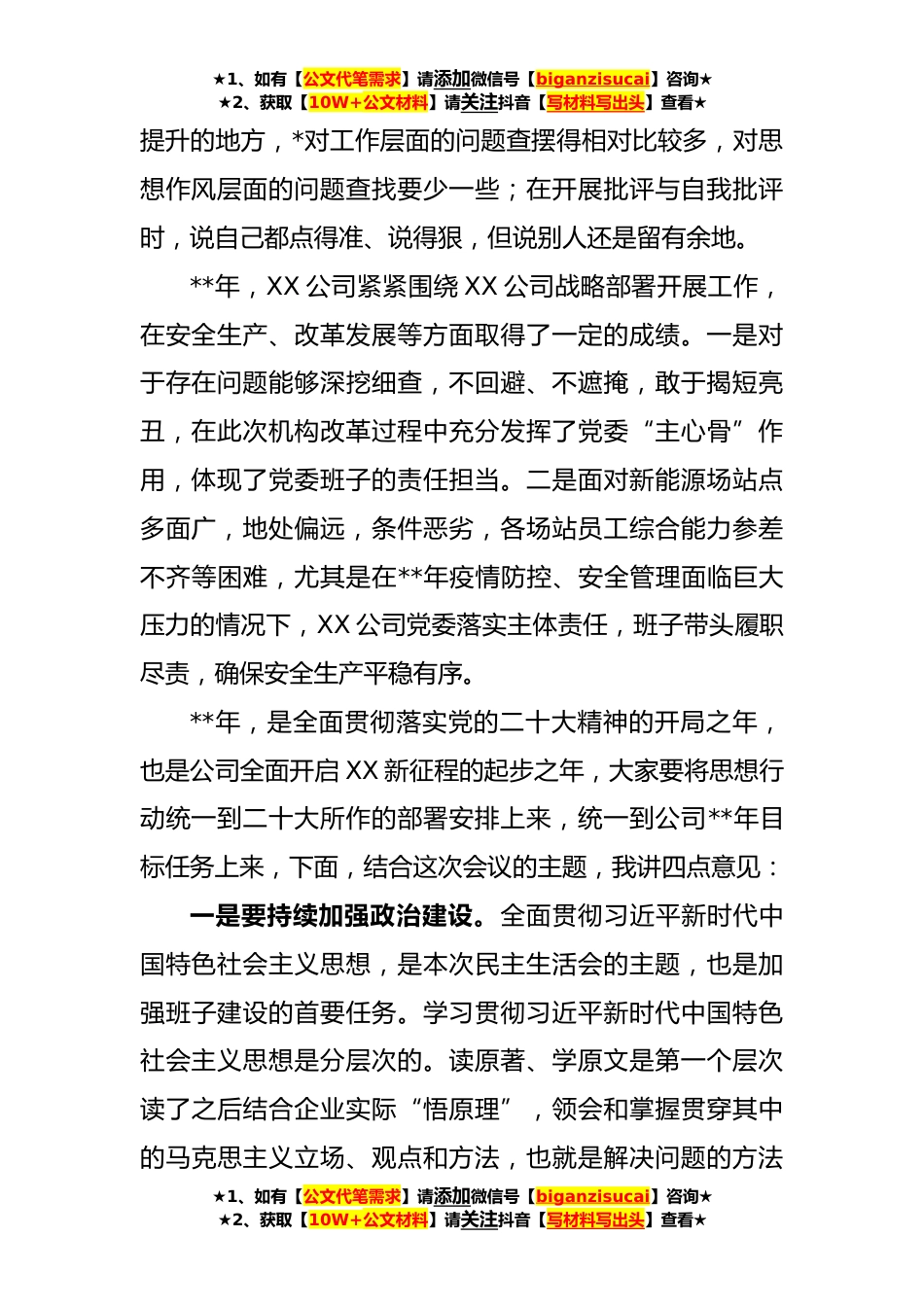 ★1、如有【公文代笔需求】请添加微信号【biganzisucai】咨询★★2、获取【10W+公文材料】请关注抖音【写材料写出头】查看★XX公司党员领导干部**年度民主生活会上的讲话在XX公司**年度党员领导干部民主生活会上的讲话同志们:根据党建联系点工作要求,今天,我参加XX公司党员领导干部民主生活会,与大家共同接受党内政治生活的洗礼和教育。本次民主生活会是贯彻习近平新时代中国特色社会主义思想和党的二十大精神的重要举措。刚才,史国建同志代表领导班子进行对照检查,五位同志先后作了个人对照发言。总体感觉,新能源公司党委能够按照上级部署要求扎实开展学习研讨,广泛听取意见建议,深入进行谈心谈话,围绕六个方面重点内容剖析查摆问题,深挖问题背后的思想根源,真诚严肃地开展批评和自我批评,有针对性...