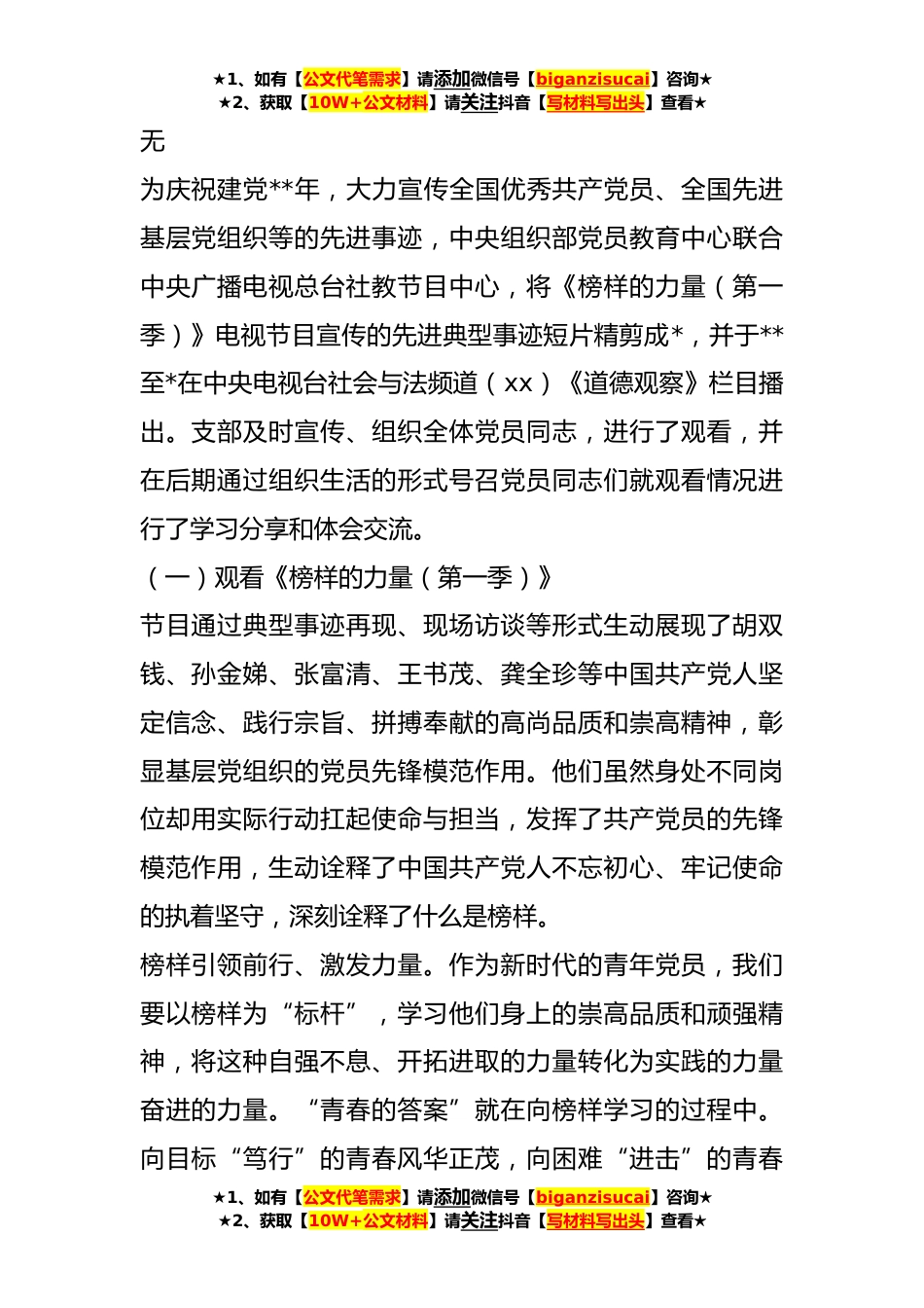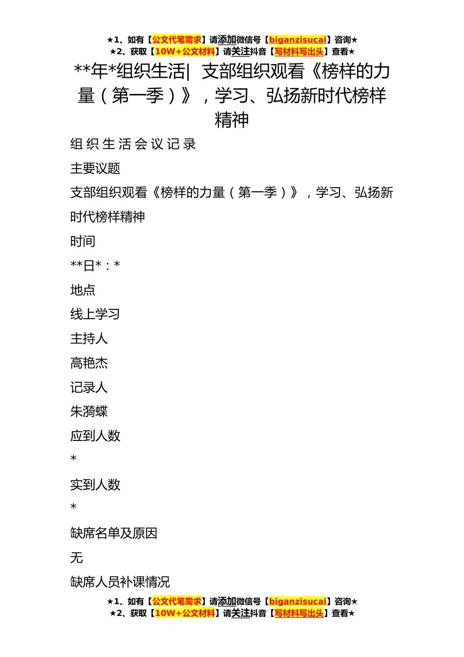 ★1、如有【公文代笔需求】请添加微信号【biganzisucai】咨询★★2、获取【10W+公文材料】请关注抖音【写材料写出头】查看★**年*组织生活|支部组织观看《榜样的力量(第一季)》,学习、弘扬新时代榜样精神组织生活会议记录主要议题支部组织观看《榜样的力量(第一季)》,学习、弘扬新时代榜样精神时间**日*:*地点线上学习主持人高艳杰记录人朱漪蝶应到人数*实到人数*缺席名单及原因无缺席人员补课情况★1、如有【公文代笔需求】请添加微信号【biganzisucai】咨询★★2、获取【10W+公文材料】请关注抖音【写材料写出头】查看★★1、如有【公文代笔需求】请添加微信号【biganzisucai】咨询★★2、获取【10W+公文材料】请关注抖音【写材料写出头】查看★无为庆祝建党**年,大力宣传全国优秀共产党员、全国先进基...