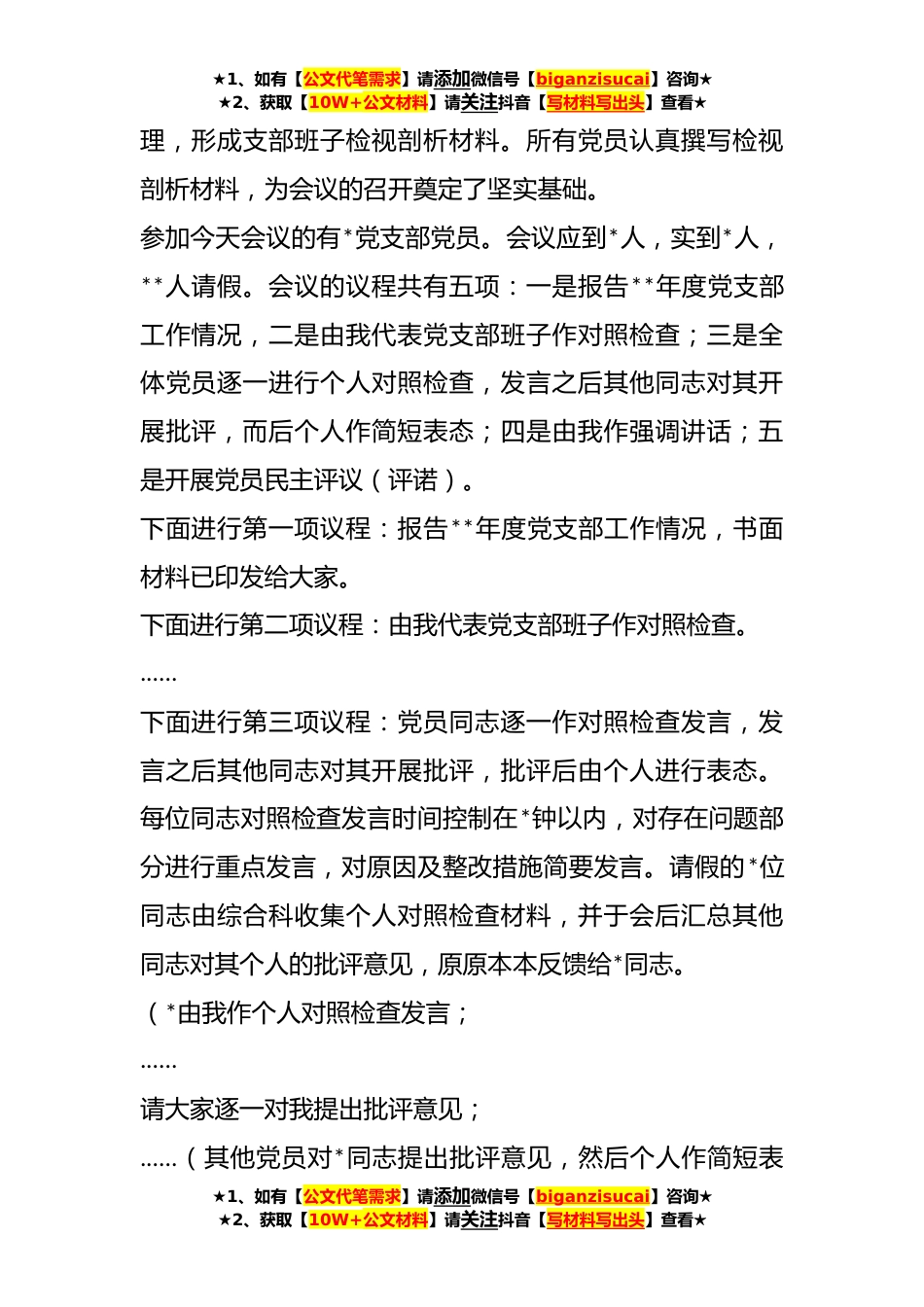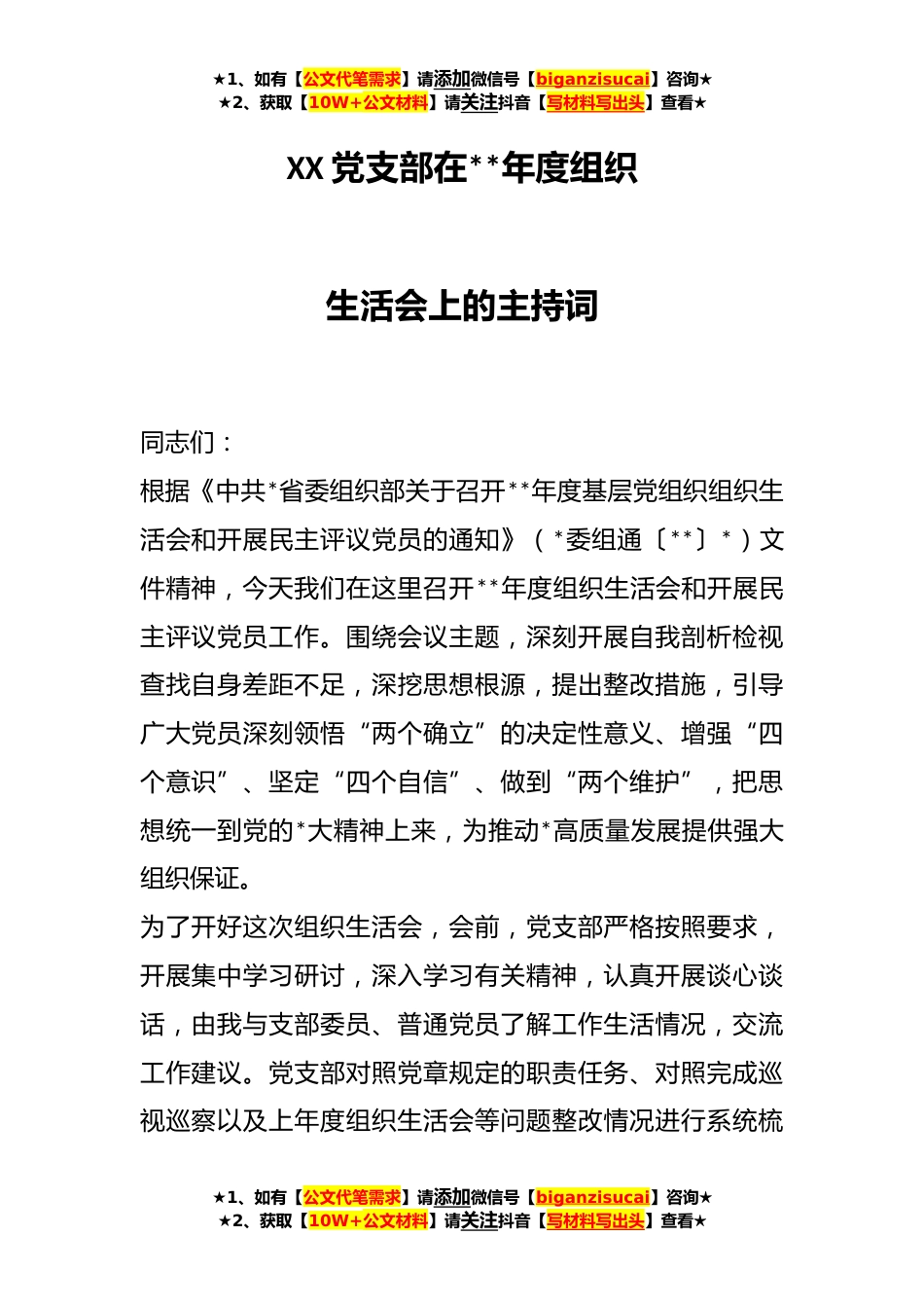 ★1、如有【公文代笔需求】请添加微信号【biganzisucai】咨询★★2、获取【10W+公文材料】请关注抖音【写材料写出头】查看★XX党支部在**年度组织生活会上的主持词同志们:根据《中共*省委组织部关于召开**年度基层党组织组织生活会和开展民主评议党员的通知》(*委组通〔**〕*)文件精神,今天我们在这里召开**年度组织生活会和开展民主评议党员工作。围绕会议主题,深刻开展自我剖析检视查找自身差距不足,深挖思想根源,提出整改措施,引导广大党员深刻领悟“两个确立”的决定性意义、增强“四个意识”、坚定“四个自信”、做到“两个维护”,把思想统一到党的*大精神上来,为推动*高质量发展提供强大组织保证。为了开好这次组织生活会,会前,党支部严格按照要求,开展集中学习研讨,深入学习有关精神,认真开...