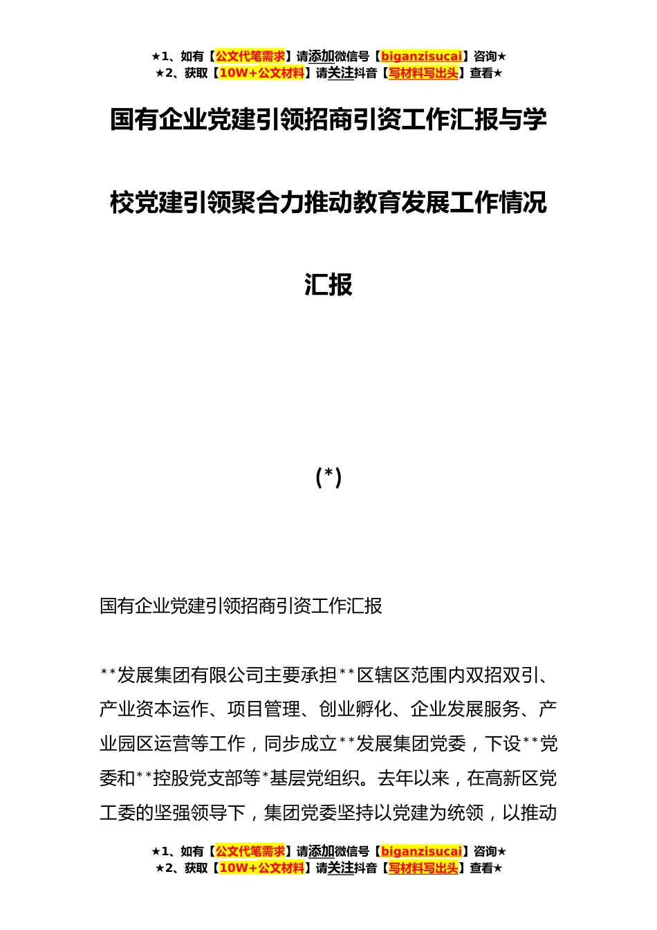 (2篇)国有企业党建引领招商引资工作汇报与学校党建引领聚合力推动教育发展工作情况汇报官方公众号