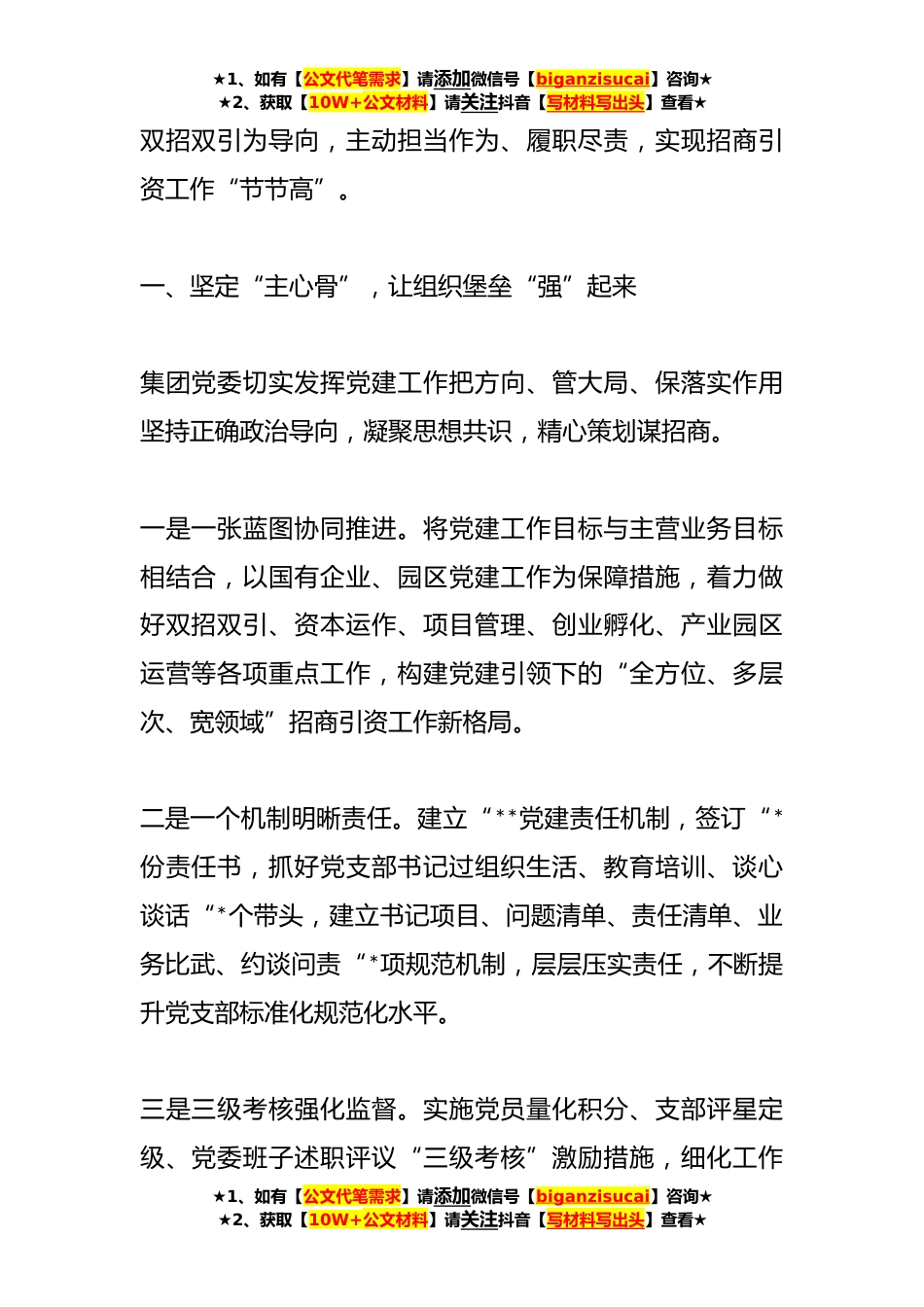 ★1、如有【公文代笔需求】请添加微信号【biganzisucai】咨询★★2、获取【10W+公文材料】请关注抖音【写材料写出头】查看★国有企业党建引领招商引资工作汇报与学校党建引领聚合力推动教育发展工作情况汇报(*)国有企业党建引领招商引资工作汇报**发展集团有限公司主要承担**区辖区范围内双招双引、产业资本运作、项目管理、创业孵化、企业发展服务、产业园区运营等工作,同步成立**发展集团党委,下设**党委和**控股党支部等*基层党组织。去年以来,在高新区党工委的坚强领导下,集团党委坚持以党建为统领,以推动★1、如有【公文代笔需求】请添加微信号【biganzisucai】咨询★★2、获取【10W+公文材料】请关注抖音【写材料写出头】查看★★1、如有【公文代笔需求】请添加微信号【biganzisucai】咨询★★2、获取...