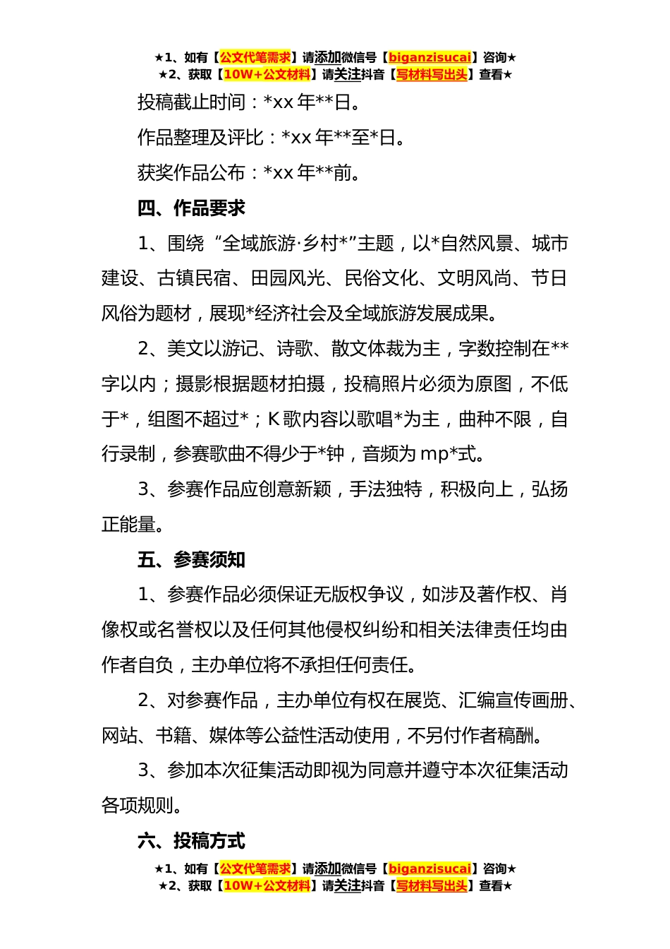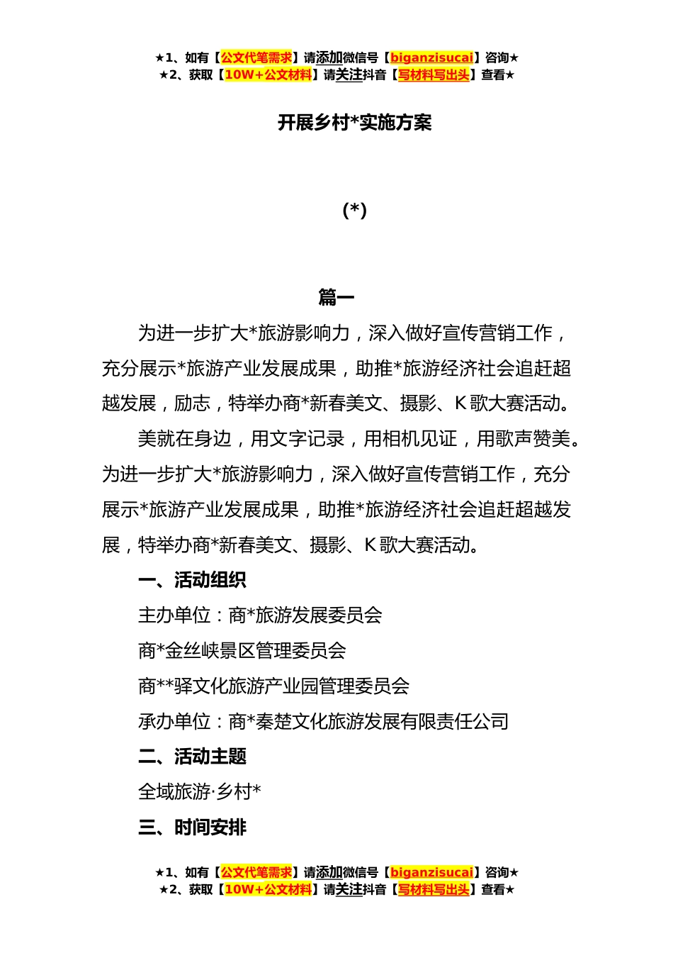 ★1、如有【公文代笔需求】请添加微信号【biganzisucai】咨询★★2、获取【10W+公文材料】请关注抖音【写材料写出头】查看★开展乡村*实施方案(*)篇一为进一步扩大*旅游影响力,深入做好宣传营销工作,充分展示*旅游产业发展成果,助推*旅游经济社会追赶超越发展,励志,特举办商*新春美文、摄影、K歌大赛活动。美就在身边,用文字记录,用相机见证,用歌声赞美。为进一步扩大*旅游影响力,深入做好宣传营销工作,充分展示*旅游产业发展成果,助推*旅游经济社会追赶超越发展,特举办商*新春美文、摄影、K歌大赛活动。一、活动组织主办单位:商*旅游发展委员会商*金丝峡景区管理委员会商**驿文化旅游产业园管理委员会承办单位:商*秦楚文化旅游发展有限责任公司二、活动主题全域旅游·乡村*三、时间安排★1、如有...