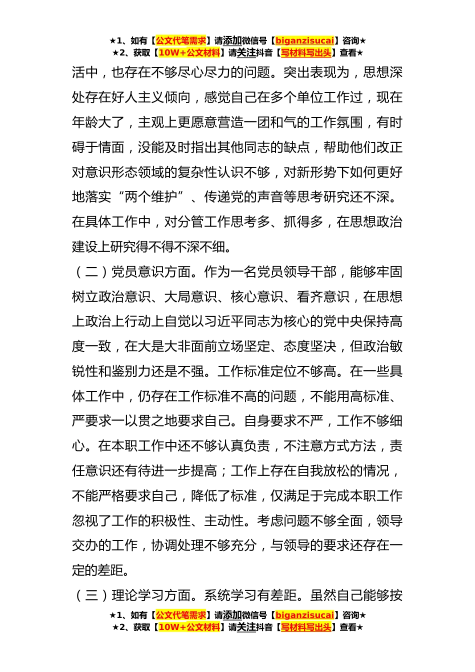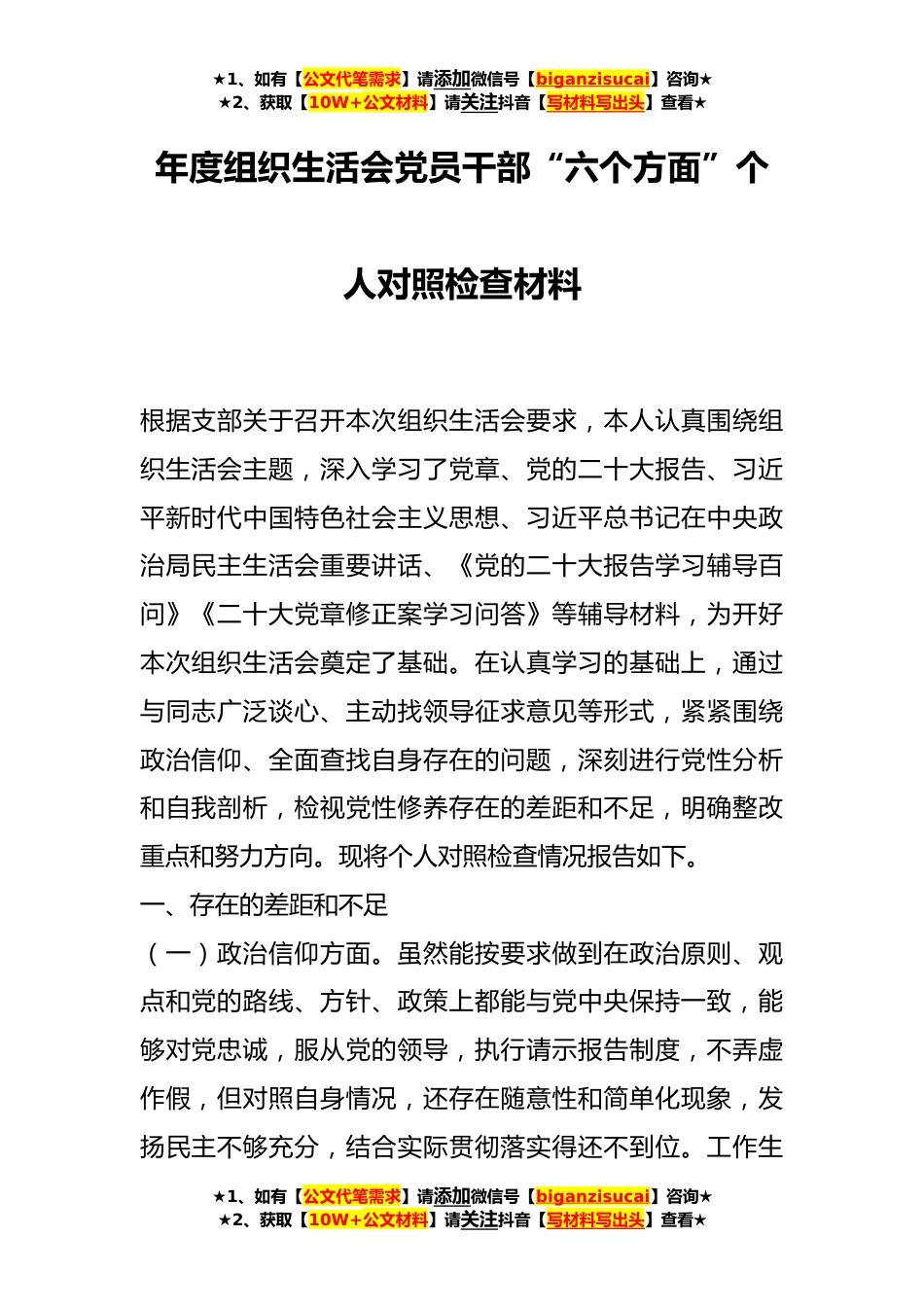 ★1、如有【公文代笔需求】请添加微信号【biganzisucai】咨询★★2、获取【10W+公文材料】请关注抖音【写材料写出头】查看★年度组织生活会党员干部“六个方面”个人对照检查材料根据支部关于召开本次组织生活会要求,本人认真围绕组织生活会主题,深入学习了党章、党的二十大报告、习近平新时代中国特色社会主义思想、习近平总书记在中央政治局民主生活会重要讲话、《党的二十大报告学习辅导百问》《二十大党章修正案学习问答》等辅导材料,为开好本次组织生活会奠定了基础。在认真学习的基础上,通过与同志广泛谈心、主动找领导征求意见等形式,紧紧围绕政治信仰、全面查找自身存在的问题,深刻进行党性分析和自我剖析,检视党性修养存在的差距和不足,明确整改重点和努力方向。现将个人对照检查情况报告如下。...