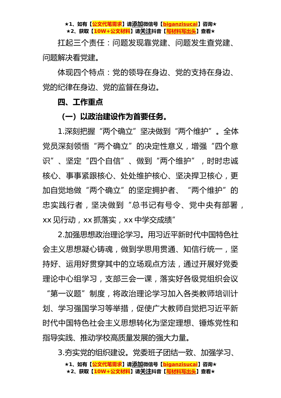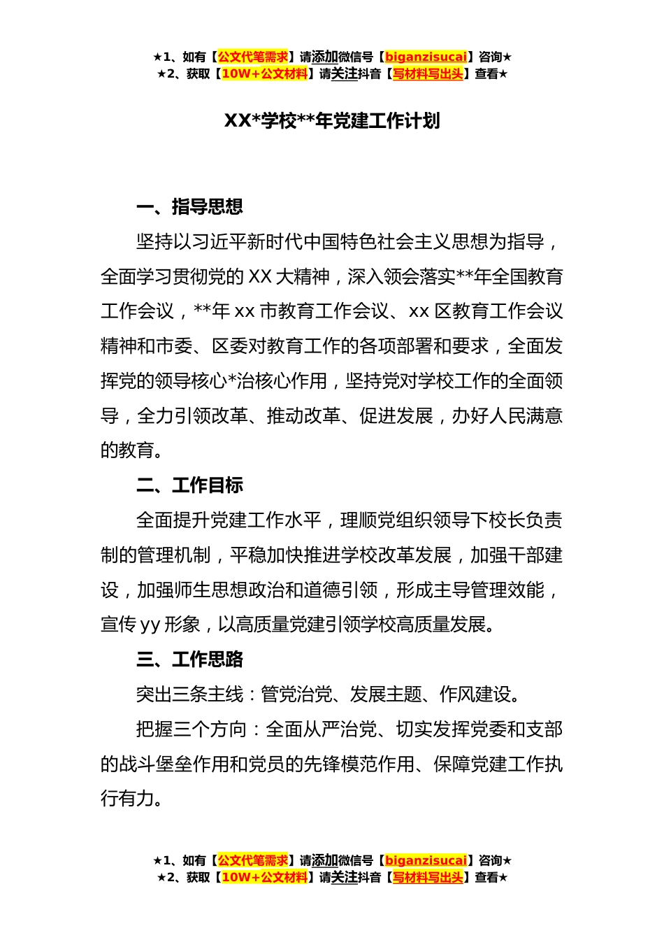★1、如有【公文代笔需求】请添加微信号【biganzisucai】咨询★★2、获取【10W+公文材料】请关注抖音【写材料写出头】查看★XX*学校**年党建工作计划一、指导思想坚持以习近平新时代中国特色社会主义思想为指导,全面学习贯彻党的XX大精神,深入领会落实**年全国教育工作会议,**年xx市教育工作会议、xx区教育工作会议精神和市委、区委对教育工作的各项部署和要求,全面发挥党的领导核心*治核心作用,坚持党对学校工作的全面领导,全力引领改革、推动改革、促进发展,办好人民满意的教育。二、工作目标全面提升党建工作水平,理顺党组织领导下校长负责制的管理机制,平稳加快推进学校改革发展,加强干部建设,加强师生思想政治和道德引领,形成主导管理效能,宣传yy形象,以高质量党建引领学校高质量发展。三、工...