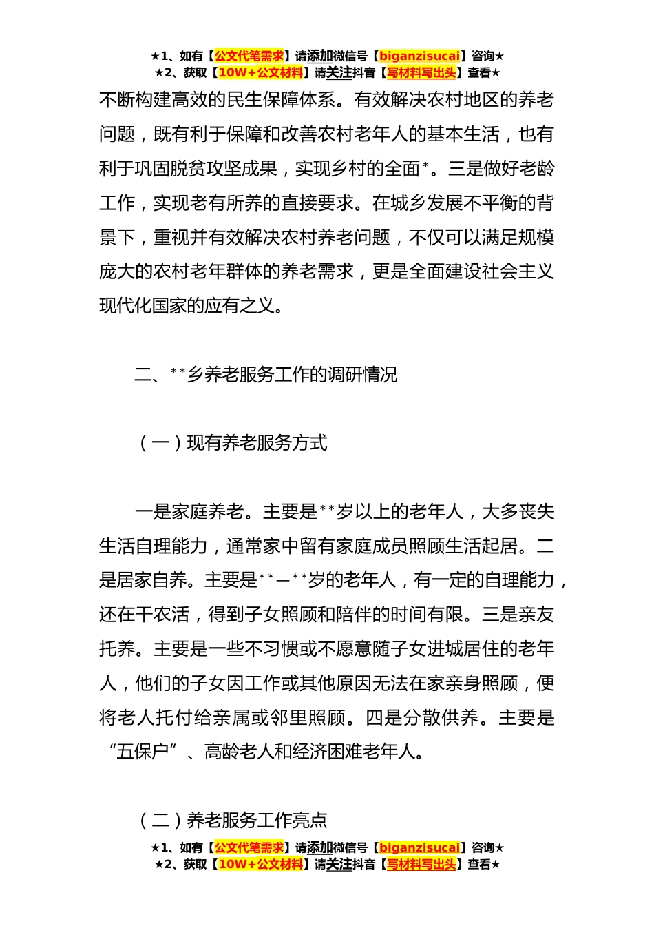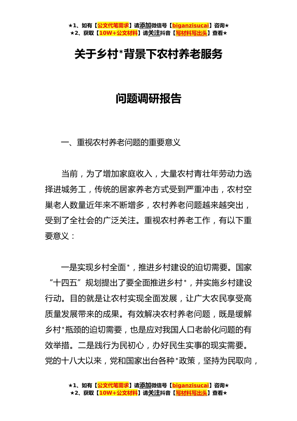 ★1、如有【公文代笔需求】请添加微信号【biganzisucai】咨询★★2、获取【10W+公文材料】请关注抖音【写材料写出头】查看★关于乡村*背景下农村养老服务问题调研报告一、重视农村养老问题的重要意义当前,为了增加家庭收入,大量农村青壮年劳动力选择进城务工,传统的居家养老方式受到严重冲击,农村空巢老人数量近年来不断增多,农村养老问题越来越突出,受到了全社会的广泛关注。重视农村养老工作,有以下重要意义:一是实现乡村全面*,推进乡村建设的迫切需要。国家“十四五”规划提出了要全面推进乡村*,并实施乡村建设行动。目的就是让农村实现全面发展,让广大农民享受高质量发展带来的成果。有效解决农村养老问题,既是缓解乡村*瓶颈的迫切需要,也是应对我国人口老龄化问题的有效举措。二是践行为民初心...