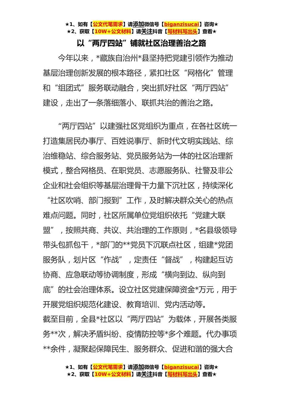 ★1、如有【公文代笔需求】请添加微信号【biganzisucai】咨询★★2、获取【10W+公文材料】请关注抖音【写材料写出头】查看★以“两厅四站”铺就社区治理善治之路今年以来,*藏族自治州*县坚持把党建引领作为推动基层治理创新发展的根本路径,紧扣社区“网格化”管理和“组团式”服务联动融合,突出抓好社区“两厅四站”建设,走出了一条落细落小、联抓共治的善治之路。“两厅四站”以建强社区党组织为重点,在各社区统一打造集居民办事厅、百姓说事厅、新时代文明实践站、综治维稳站、综合服务站、党员服务站为一体的社区治理新模式,整合网格员、在职党员、志愿服务队、社警及非公企业和社会组织等基层治理骨干力量下沉社区,持续深化“社区吹哨、部门报到”工作,及时解决群众关心的热点难点问题。同时,社区所...