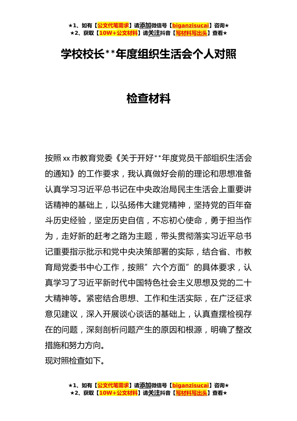 ★1、如有【公文代笔需求】请添加微信号【biganzisucai】咨询★★2、获取【10W+公文材料】请关注抖音【写材料写出头】查看★学校校长**年度组织生活会个人对照检查材料按照xx市教育党委《关于开好**年度党员干部组织生活会的通知》的工作要求,我认真做好会前的理论和思想准备认真学习习近平总书记在中央政治局民主生活会上重要讲话精神的基础上,以弘扬伟大建党精神,坚持党的百年奋斗历史经验,坚定历史自信,不忘初心使命,勇于担当作为,走好新的赶考之路为主题,带头贯彻落实习近平总书记重要指示批示和党中央决策部署的实际,结合省、市教育局党委书中心工作,按照”六个方面”的具体要求,认真学习了习近平新时代中国特色社会主义思想及党的二十大精神等。紧密结合思想、工作和生活实际,在广泛征求意见建...