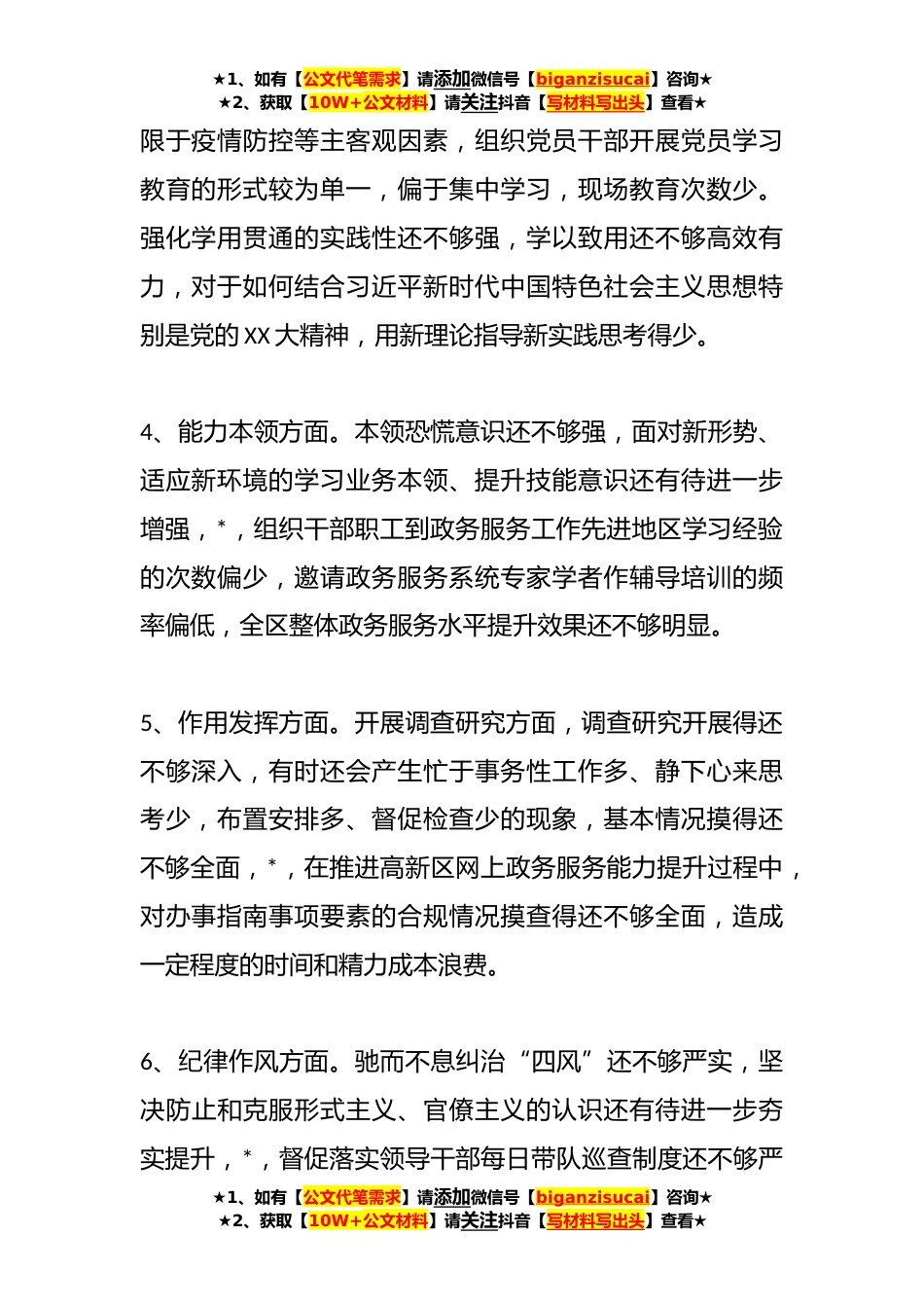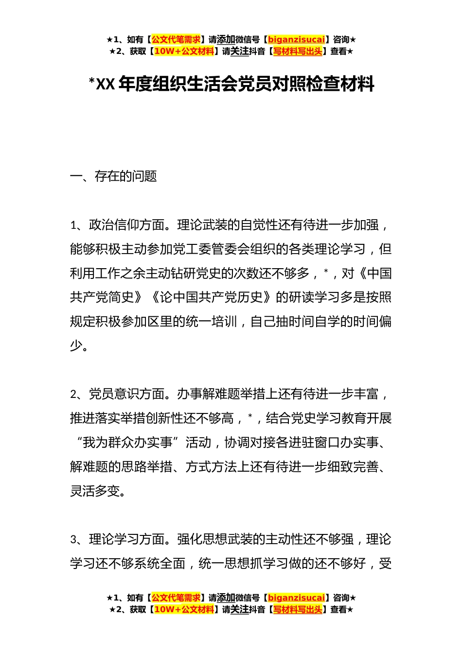 ★1、如有【公文代笔需求】请添加微信号【biganzisucai】咨询★★2、获取【10W+公文材料】请关注抖音【写材料写出头】查看★*XX年度组织生活会党员对照检查材料一、存在的问题1、政治信仰方面。理论武装的自觉性还有待进一步加强,能够积极主动参加党工委管委会组织的各类理论学习,但利用工作之余主动钻研党史的次数还不够多,*,对《中国共产党简史》《论中国共产党历史》的研读学习多是按照规定积极参加区里的统一培训,自己抽时间自学的时间偏少。2、党员意识方面。办事解难题举措上还有待进一步丰富,推进落实举措创新性还不够高,*,结合党史学习教育开展“我为群众办实事”活动,协调对接各进驻窗口办实事、解难题的思路举措、方式方法上还有待进一步细致完善、灵活多变。3、理论学习方面。强化思想武装的...